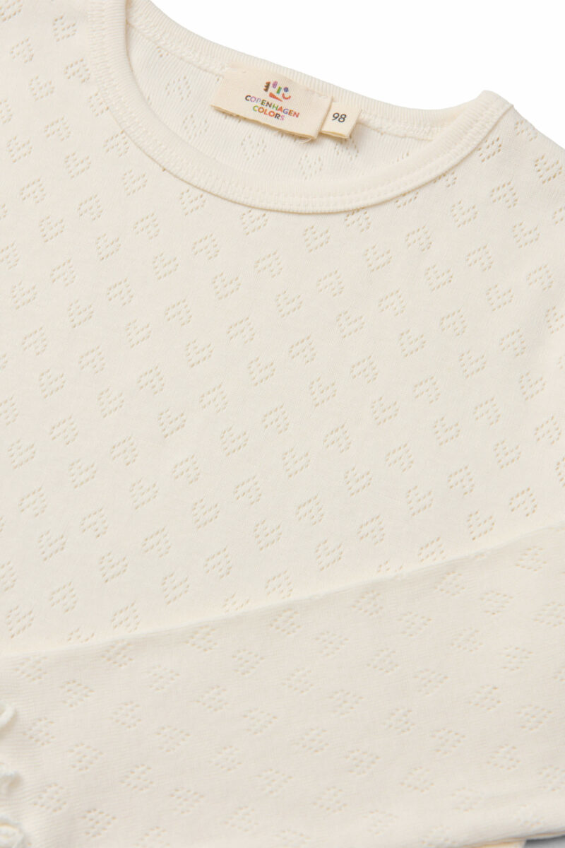 De fine bølgede kanter ved ærmer og bund tilføjer et ekstra sødt touch, der gør den perfekt til både hverdag og lidt finere anledninger.
