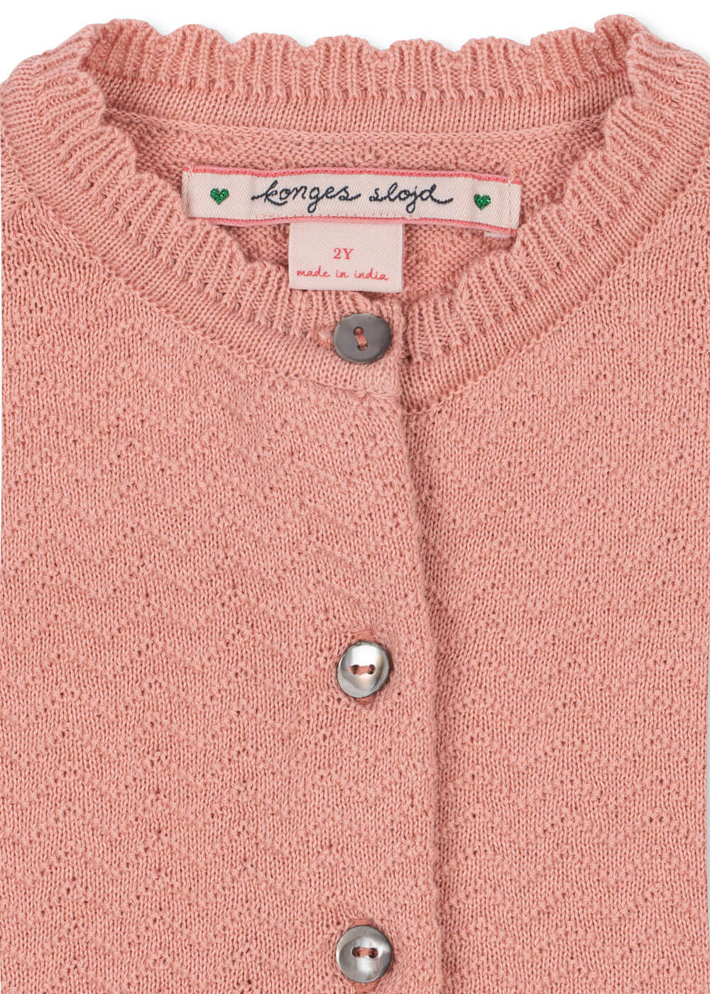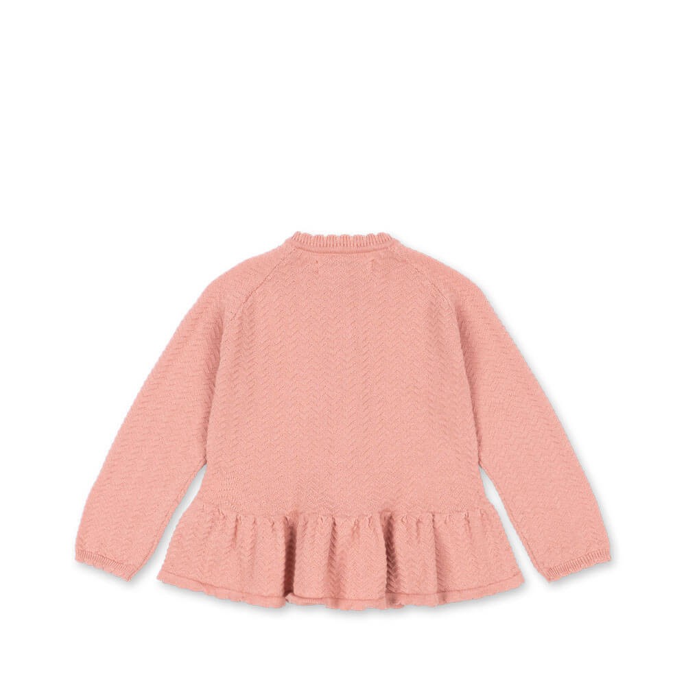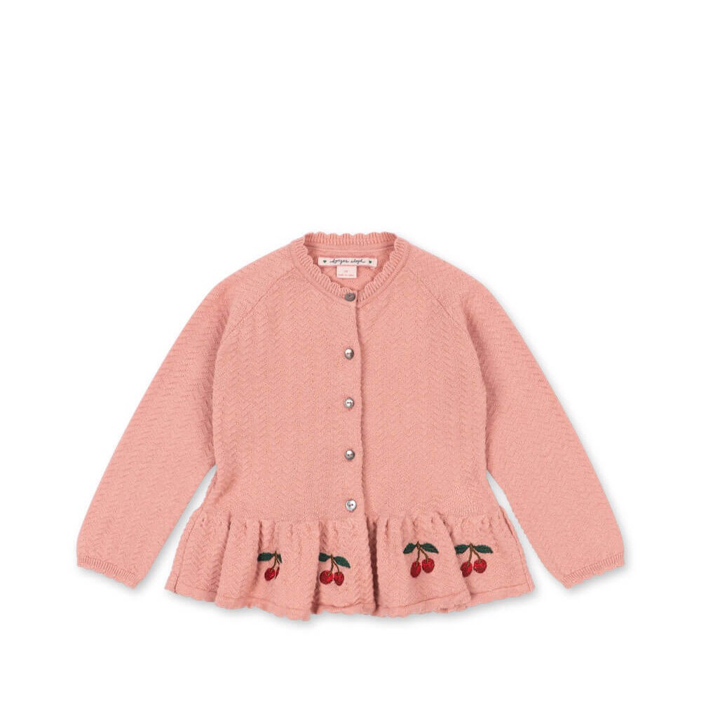 Cypres cardiganen er lavet i en smuk Rosette rosa nuance og har det karakteristiske cherrybroderi forneden.