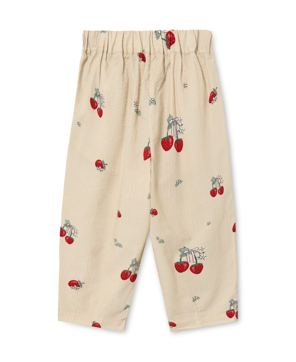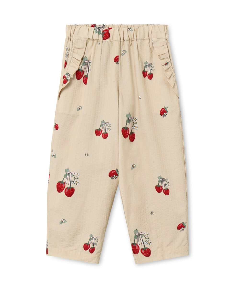 De fine Elma bukser fra FLIINK er designet i den bløde nuance Sandshell og prydet med det fineste print af små jordbær og blomster.