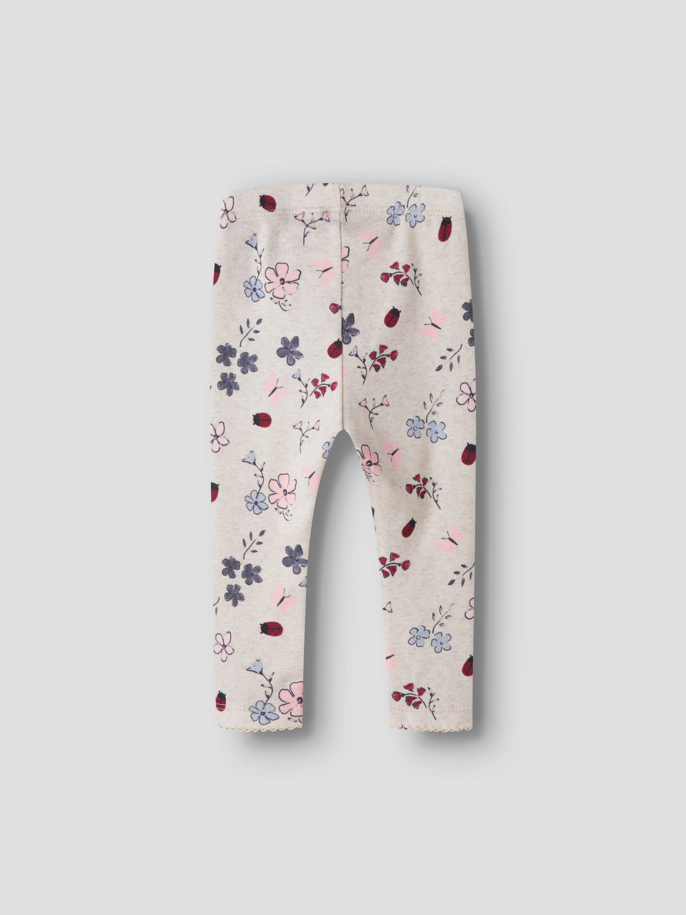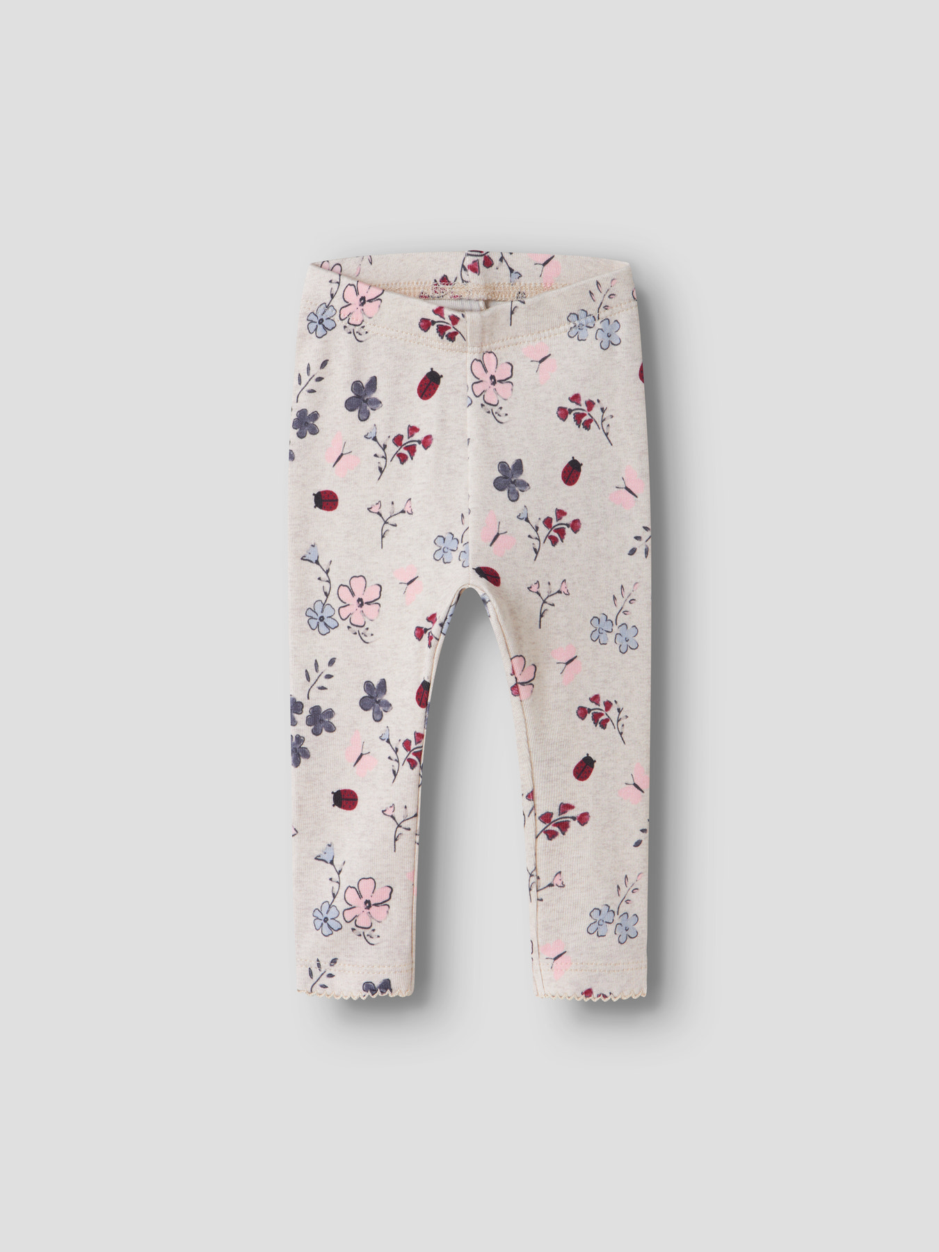 Bløde og behagelige baby leggings fra Name It med et fint all-over print af blomster og små mariehøns.