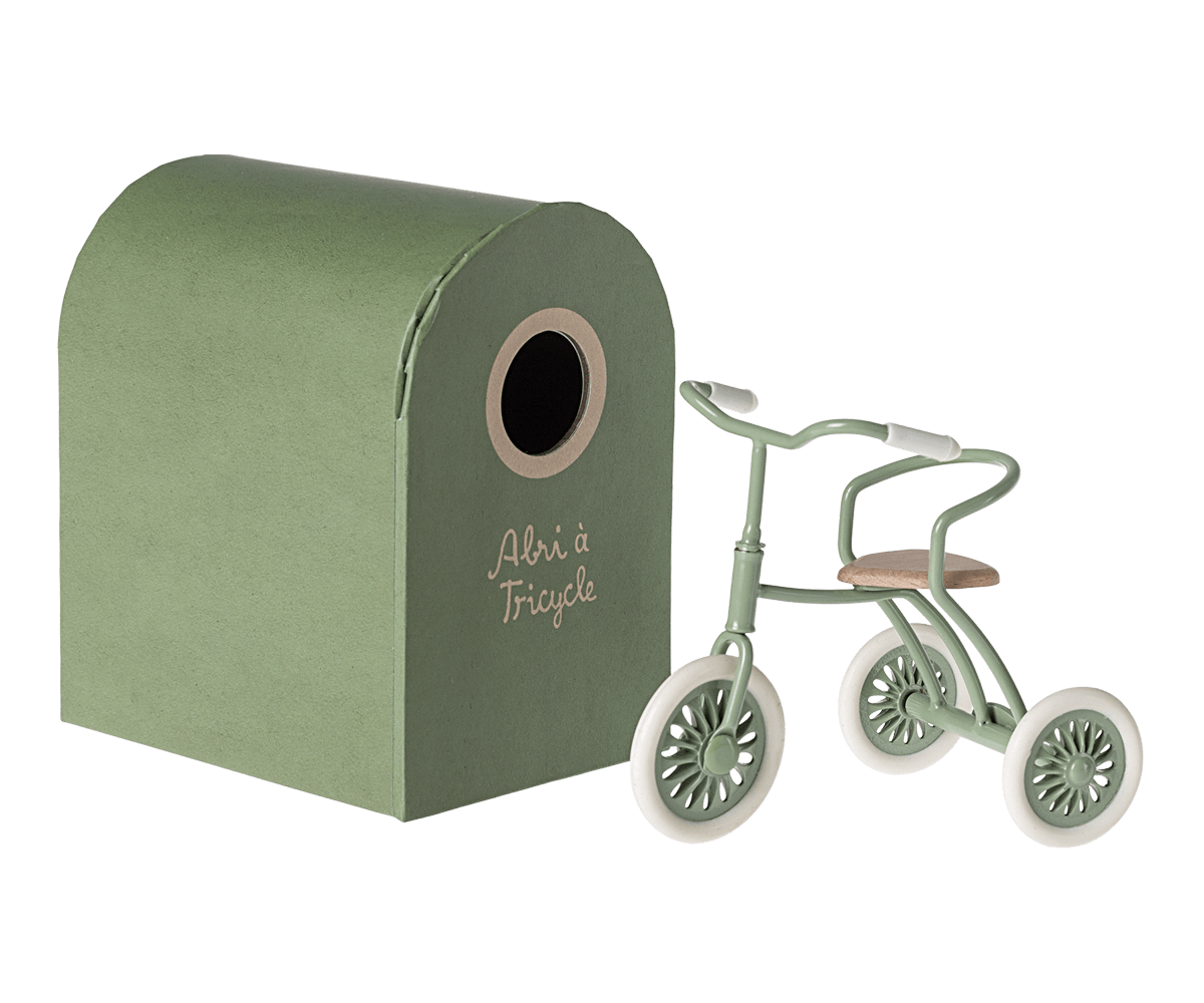 Denne søde grønne cykel med garage fra Maileg er perfekt til storebror- og storesøster-mus og giver masser af muligheder for fantasifuld leg.