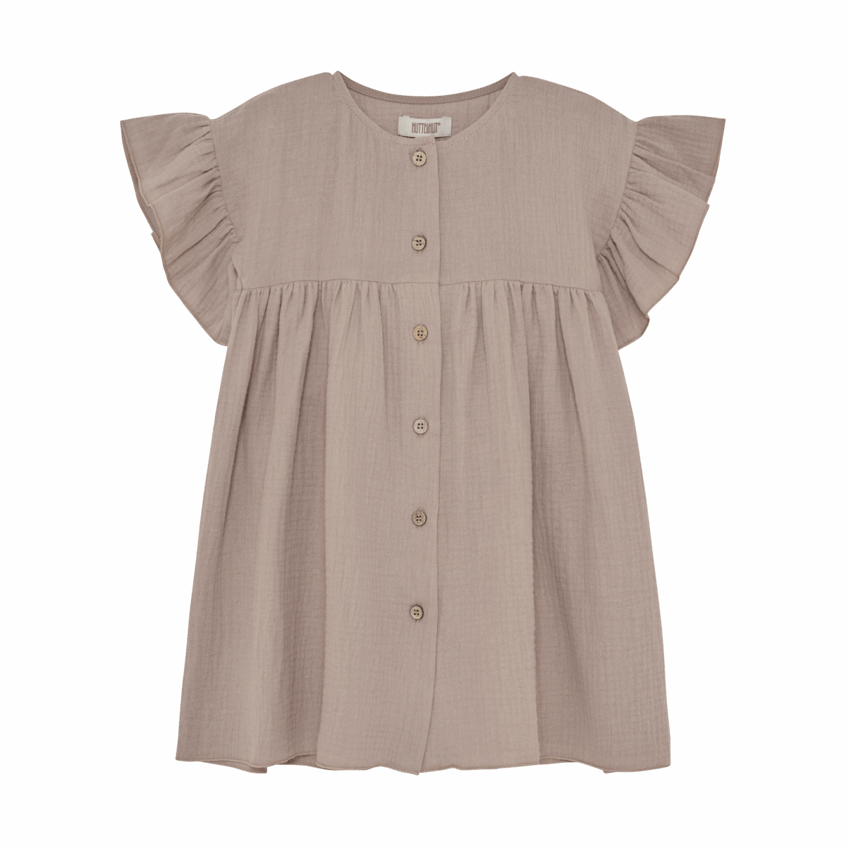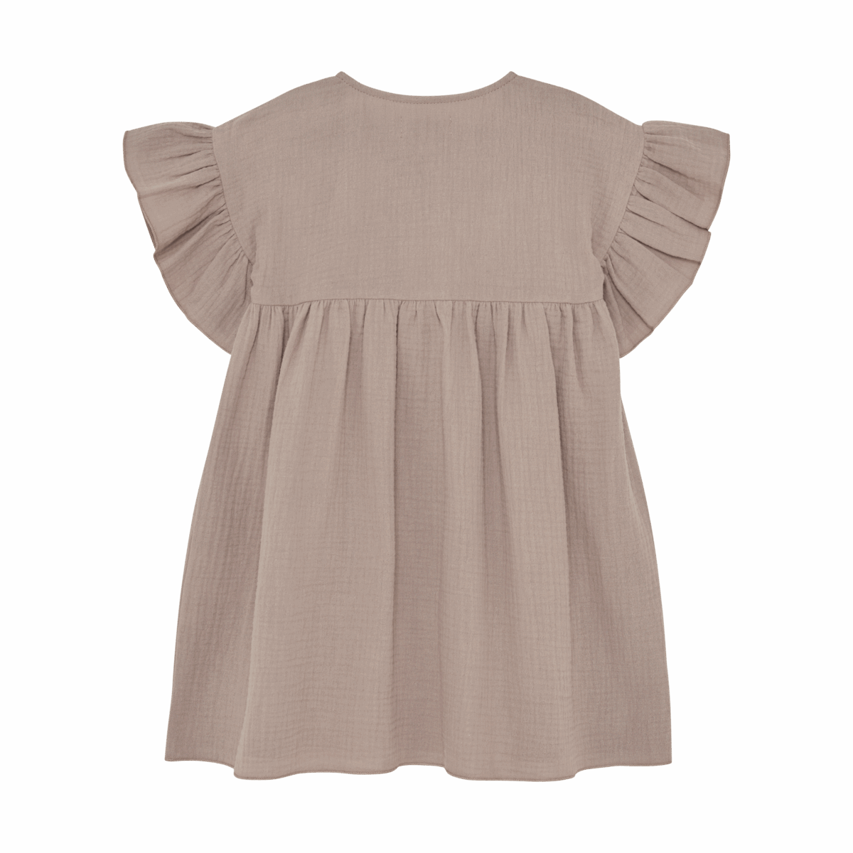 Den smukke lysebrune kjole i muslin kvalitet har korte flæseærmer og er gennemknappet på fronten.
