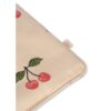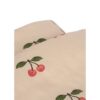 Sengetøjet er prydet med et yndigt kirsebærmønster på en lys baggrund, hvilket giver det et fint og legende udtryk.