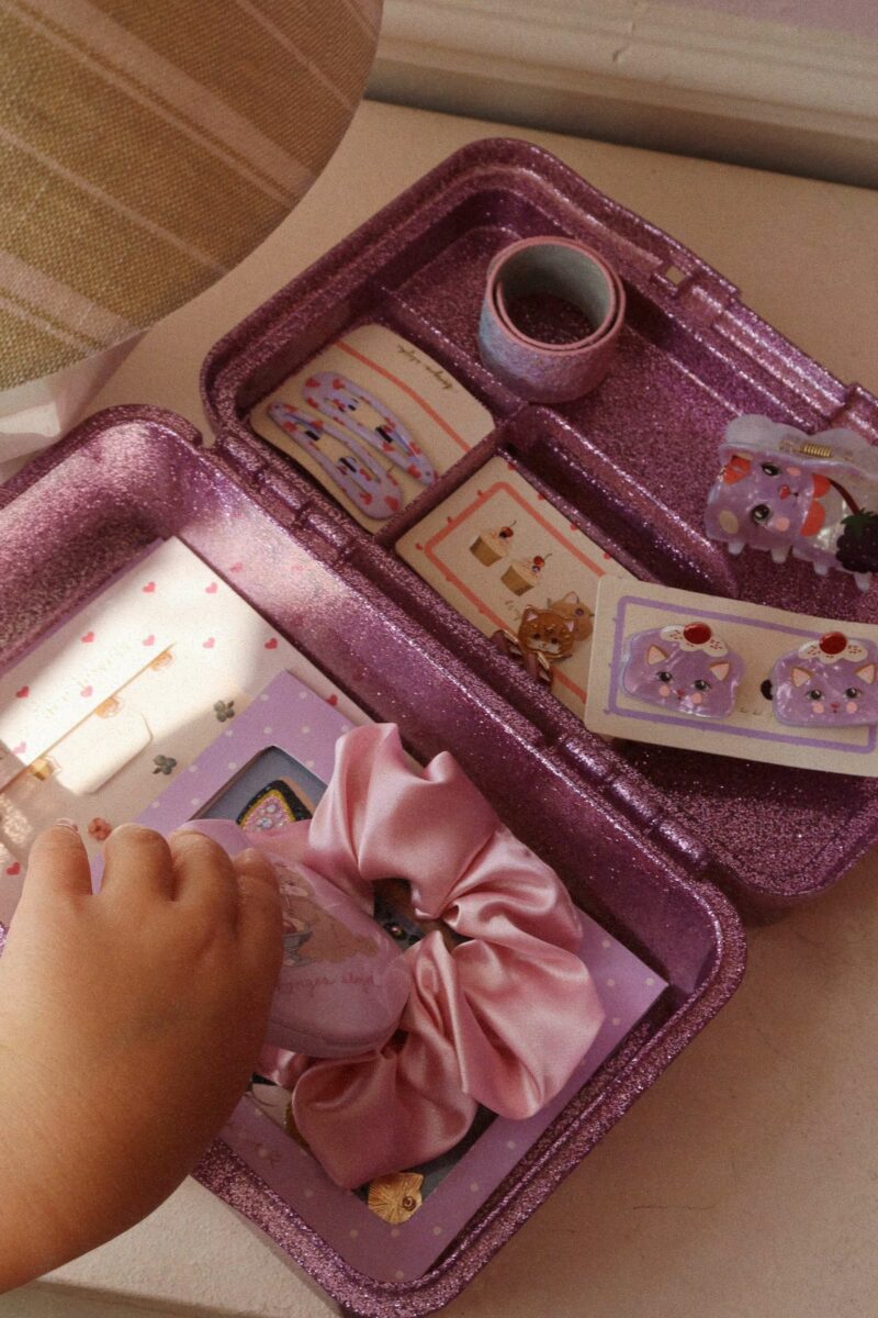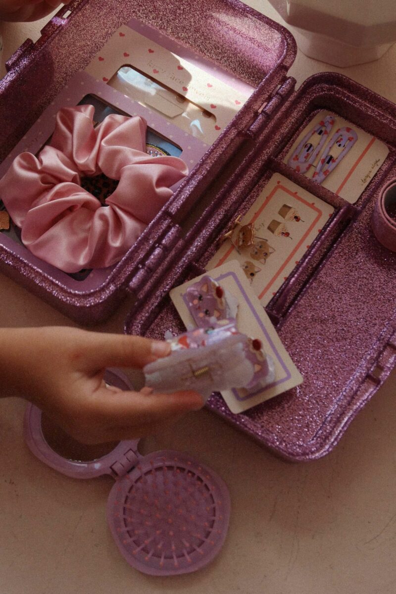 Kufferten er fyldt med sjove accessories til styling og leg – perfekt til små kreative øjeblikke.