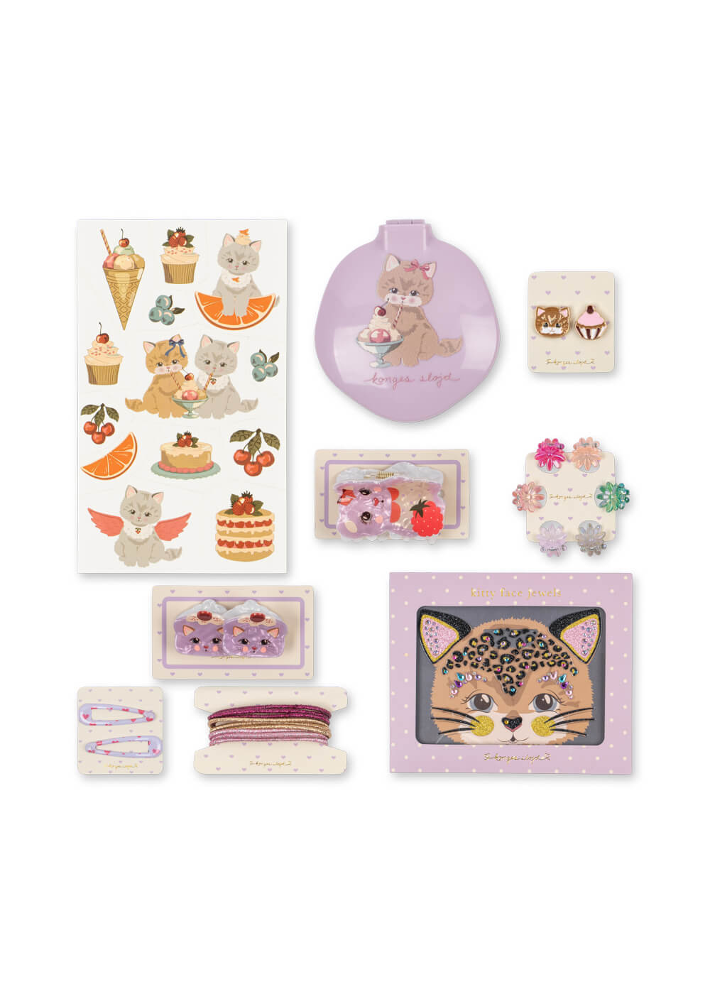 Sættet indeholder alt fra hårspænder og elastikker til spejl, børste og fine detaljer, der gør det ekstra sjovt at gøre sig klar.