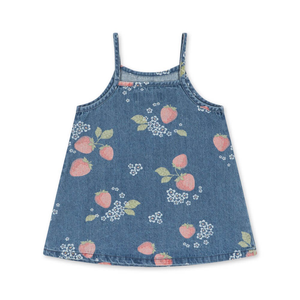 Den smukke Magot strop kjole fra Konges Sløjd er lavet i flot denim blå med fint Marmelade Sun print.