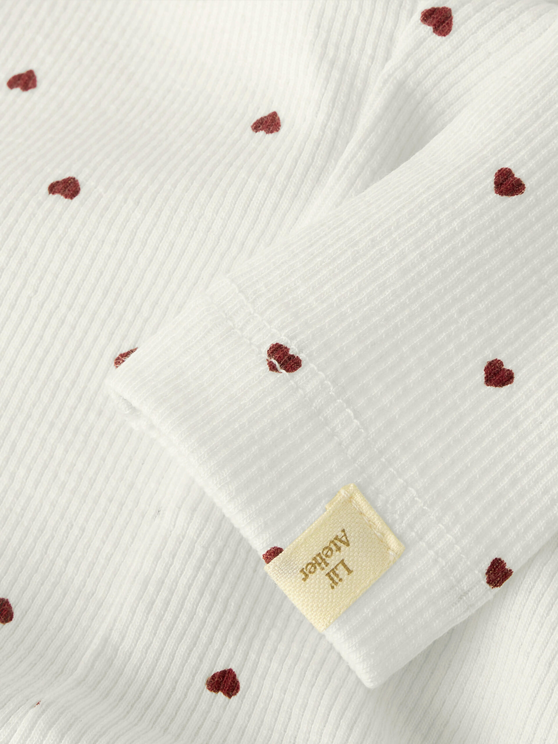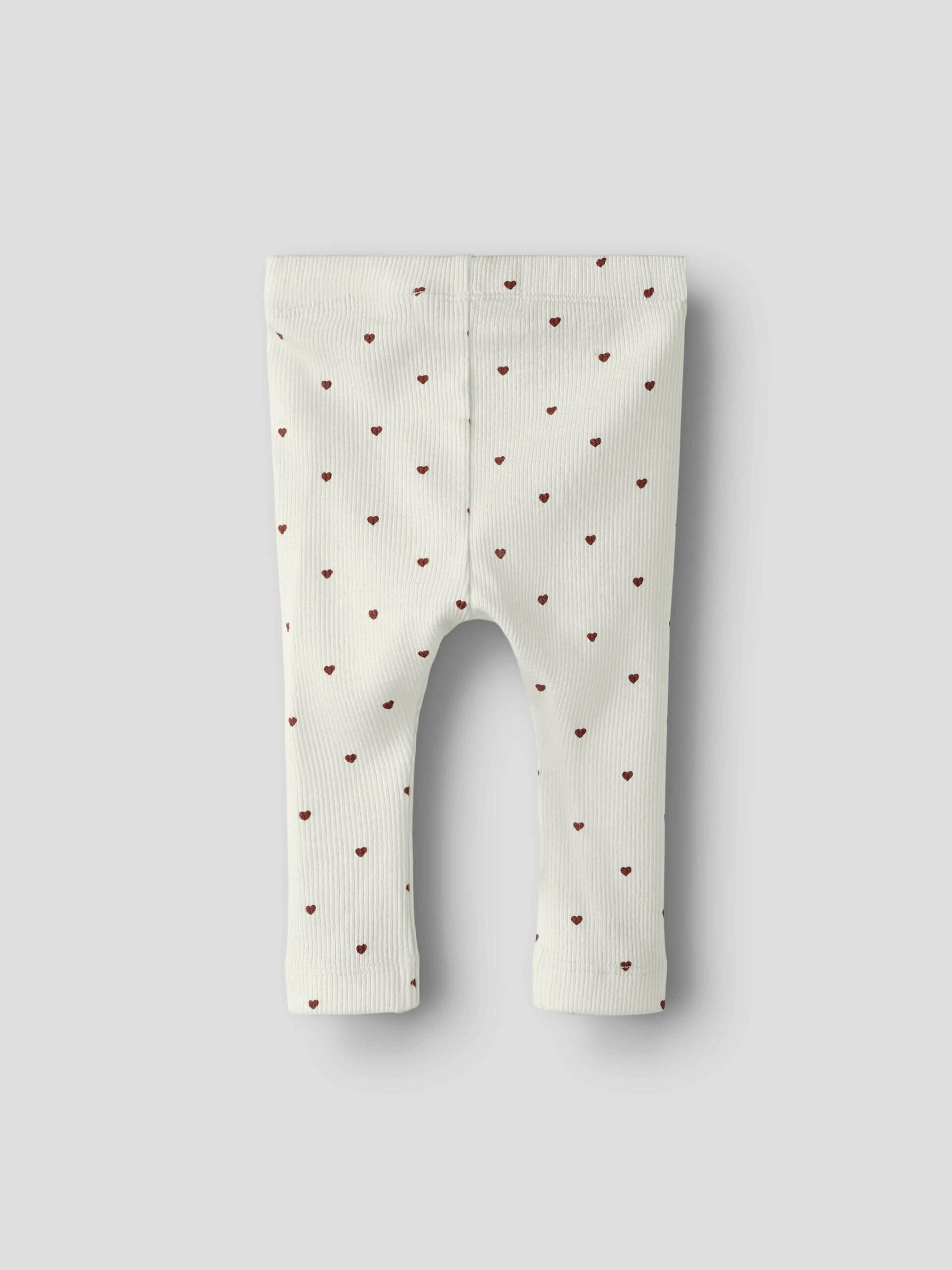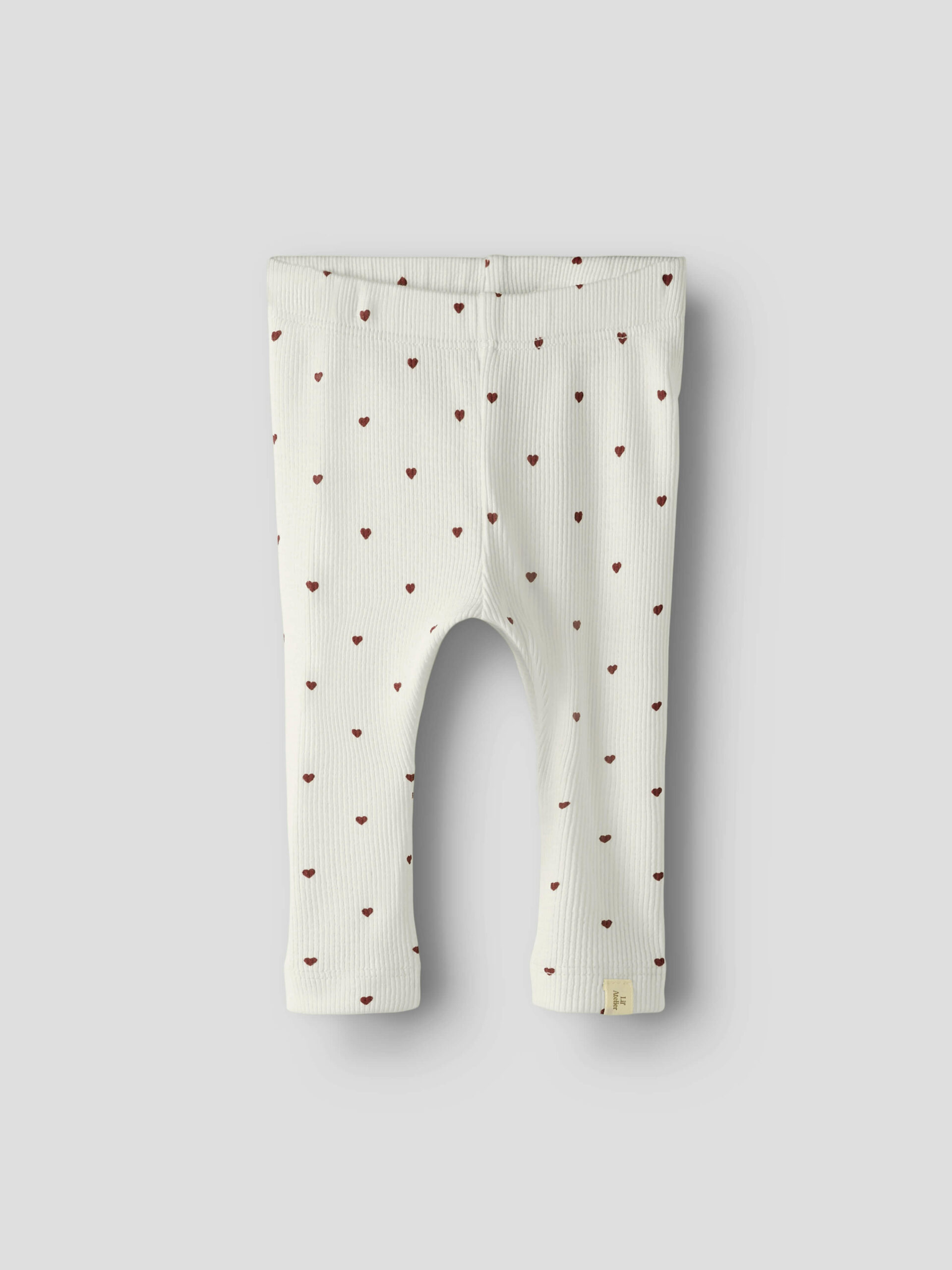 Søde og bløde baby leggings fra Lil’ Atelier, designet i en smuk hvid ribkvalitet med fine mørkerøde hjerter.
