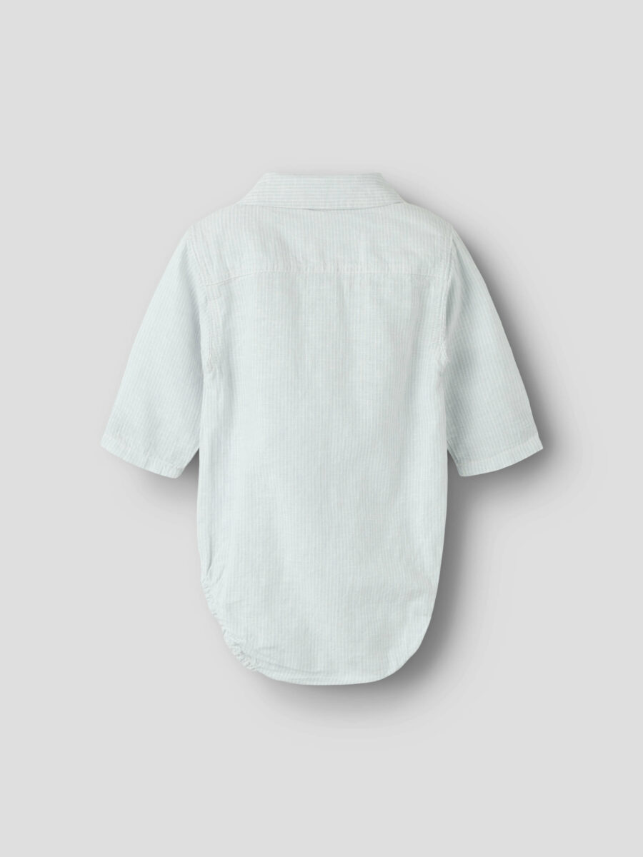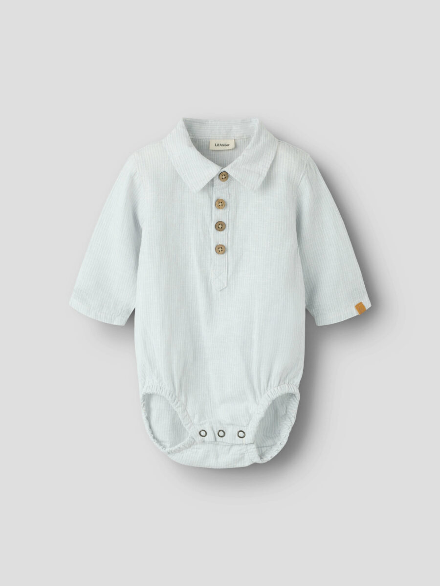 Bodyen er designet med skjortekrave og knaplukning foran, som giver et tidløst look, mens trykknapper i bunden gør den praktisk i brug.