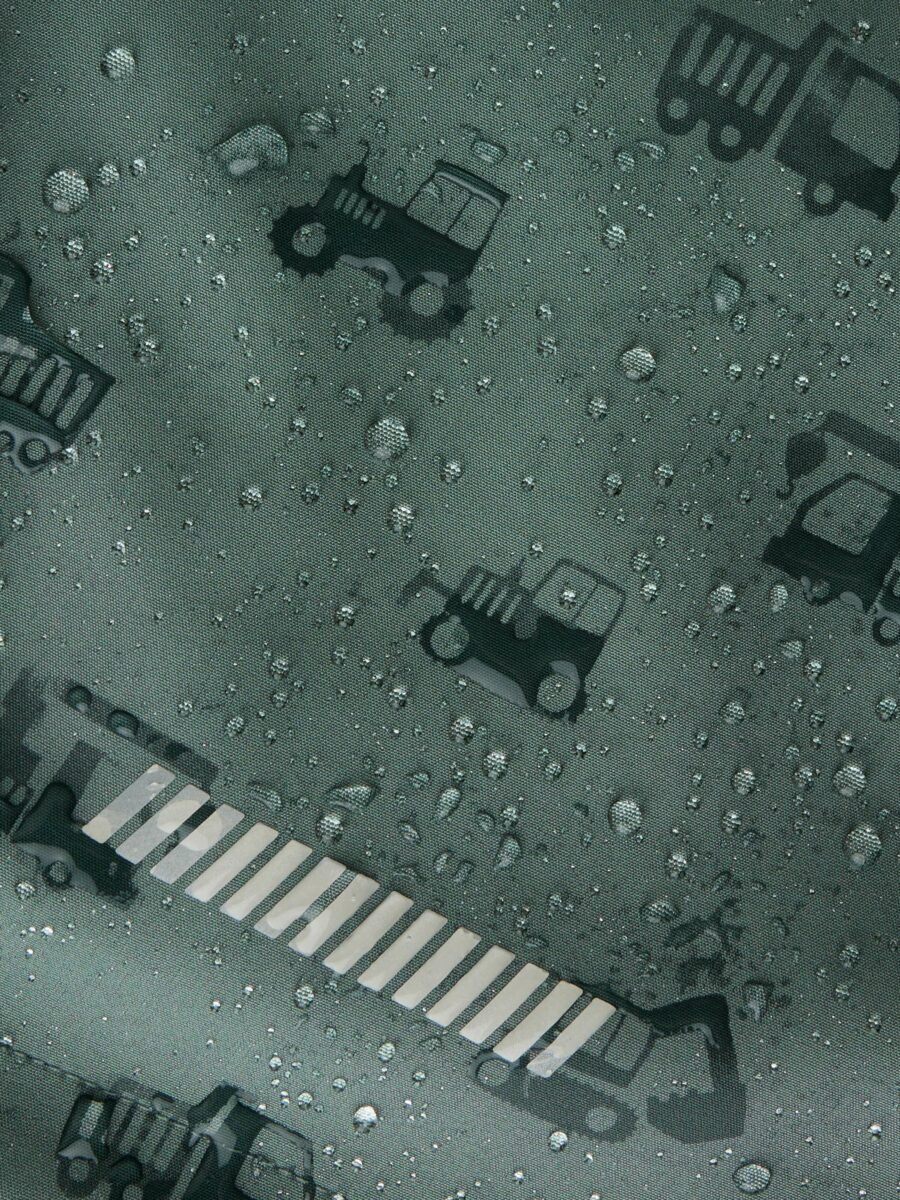 Jakken har et sjovt magic-print, der skifter farve, når det bliver vådt, og er samtidig både vandtæt og åndbar.