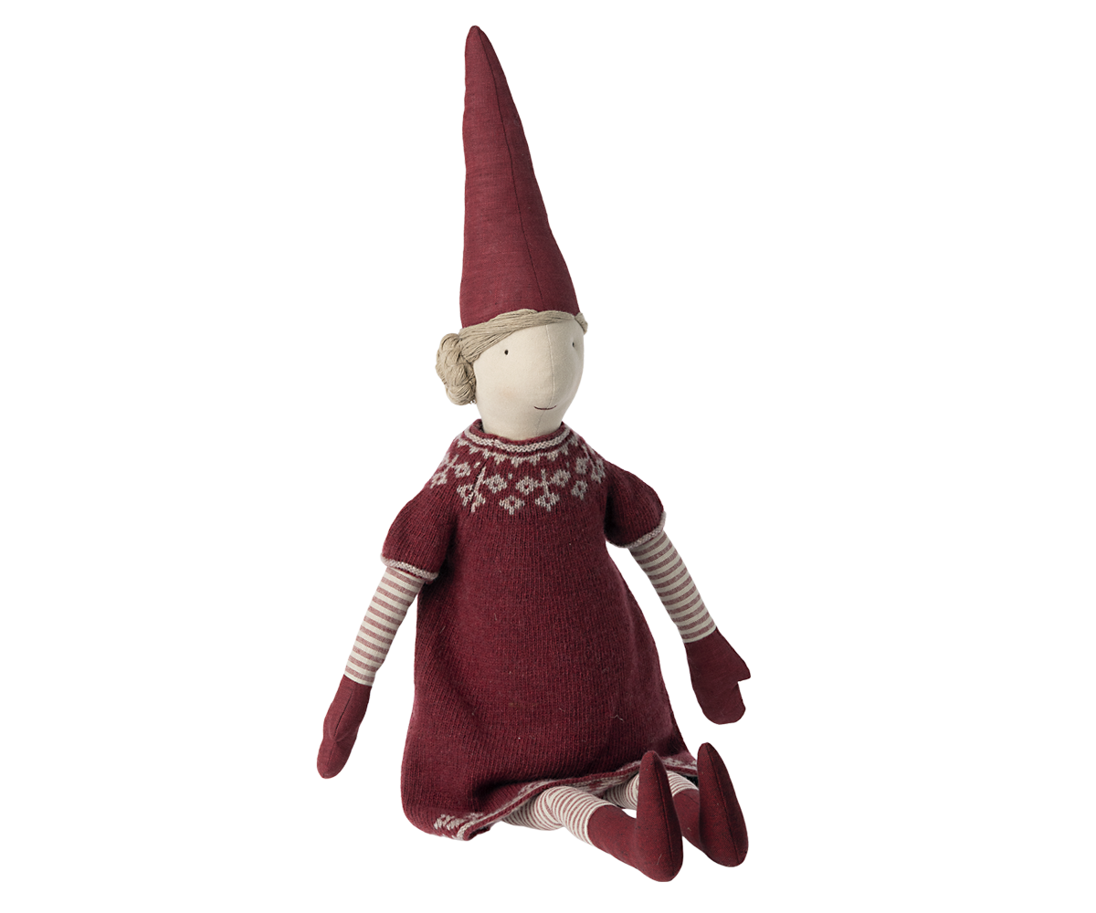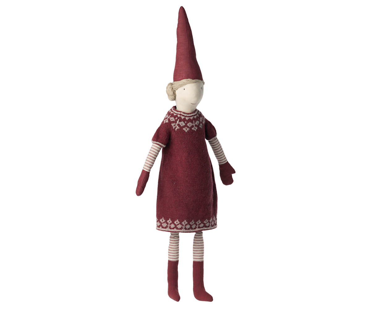 Julemandens kone er simpelthen så fin og sød med hendes røde strikkede kjole og den røde nissehue.