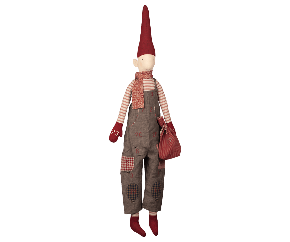 Kalendernissen har 24 ringe/lommer til at sætte små gaver fast i – en for hver dag før jul.