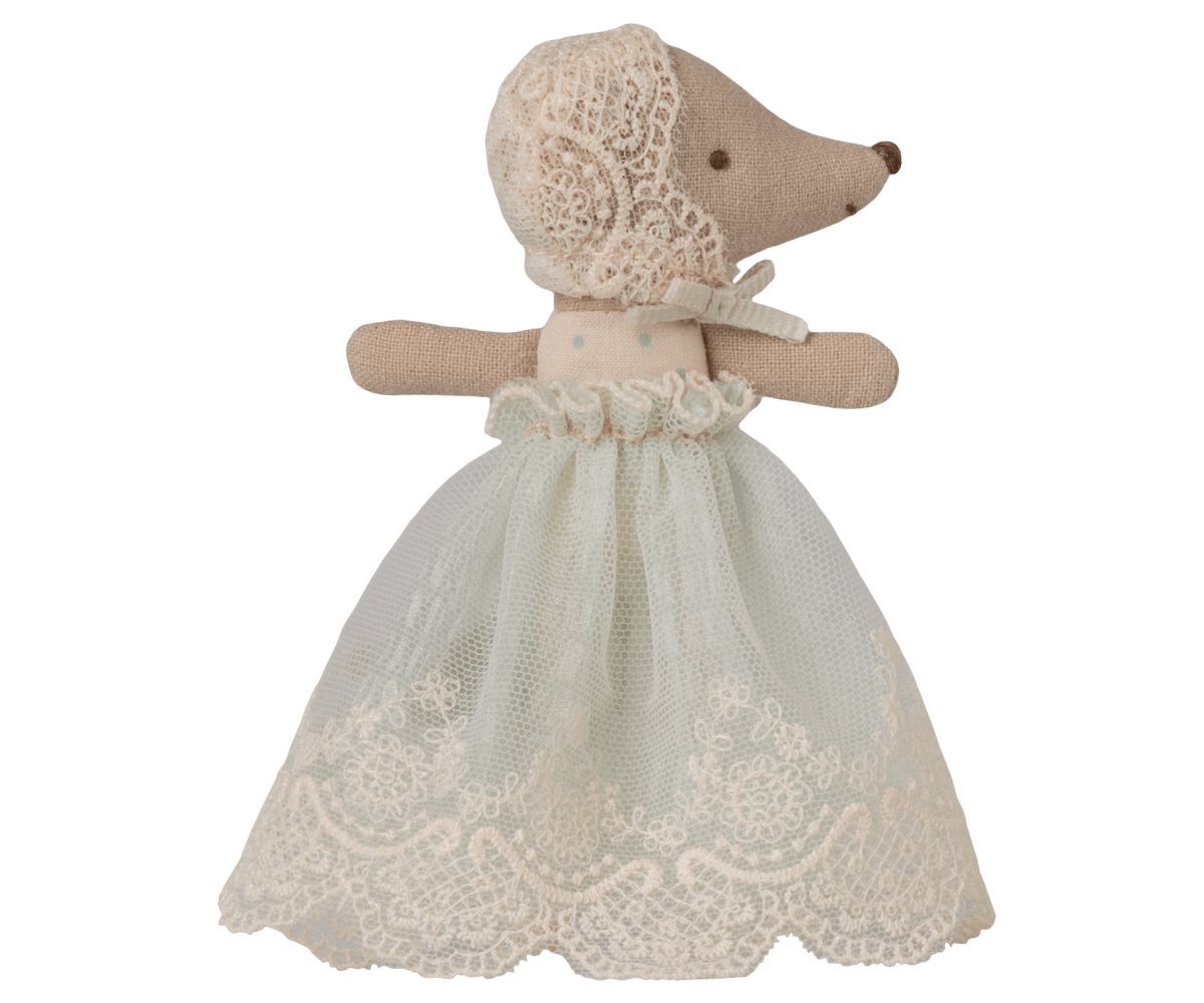 Denne fine baby mus fra Maileg er klædt i en drømmende mintfarvet kjole, der emmer af lethed og elegance.