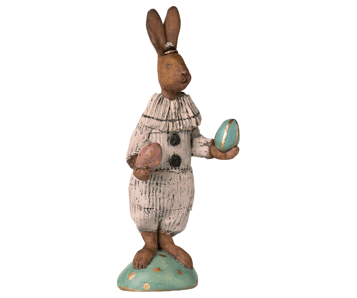 Denne søde påske parade nr. 21 fra Maileg forestiller en sød kanin, der holder fine påskeæg i begge hænder.