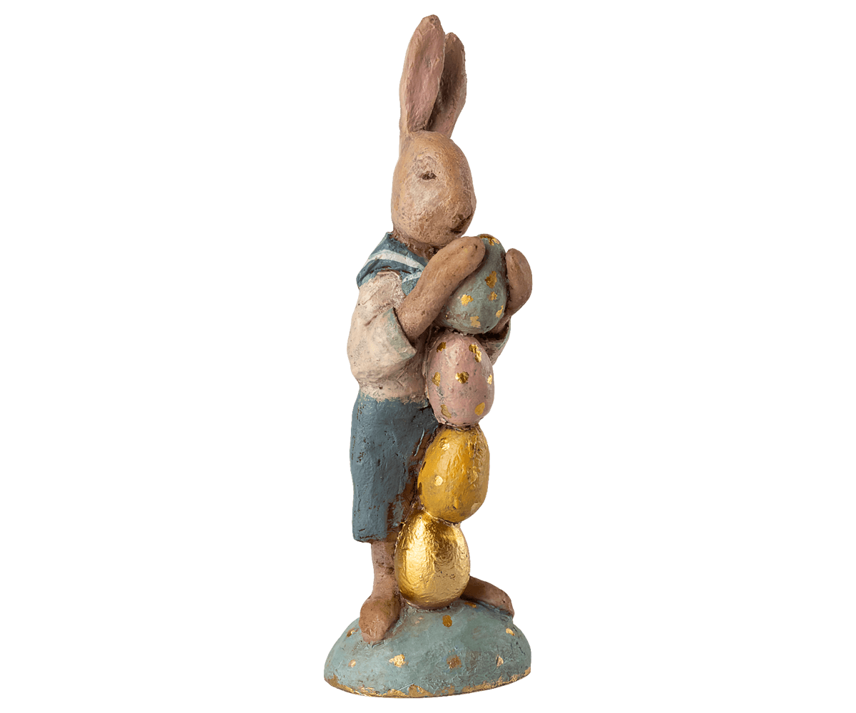 Sød dekorativ påskekanin fra Maileg forestiller en sød lille kanin, der holder farvede påskeæg i armene.