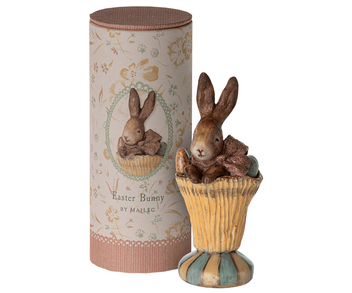 Denne fine påske kanin fra Maileg forestiller en sød lille kanin, der sidder i en dekorativ kop omgivet af fine detaljer.