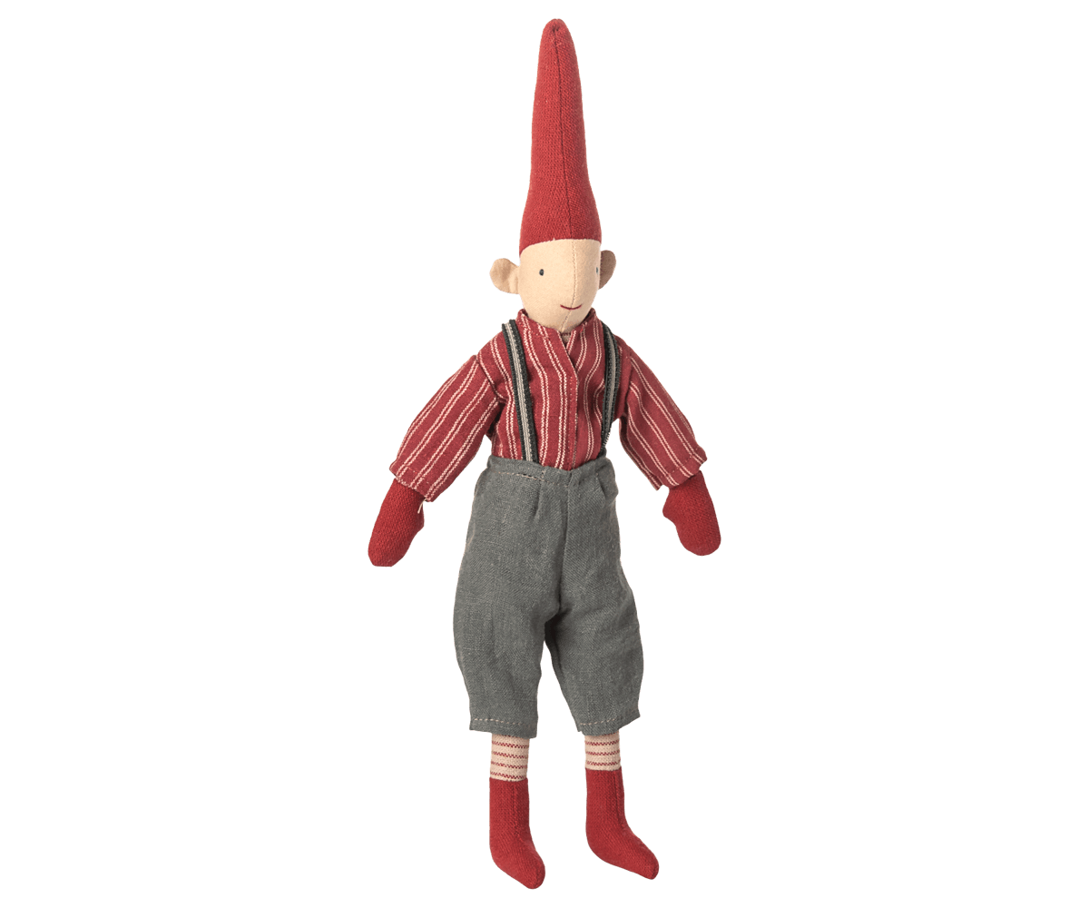 Sejeste nisse dreng fra Maileg med en flot rød stribet skjorte og smækbukser på.