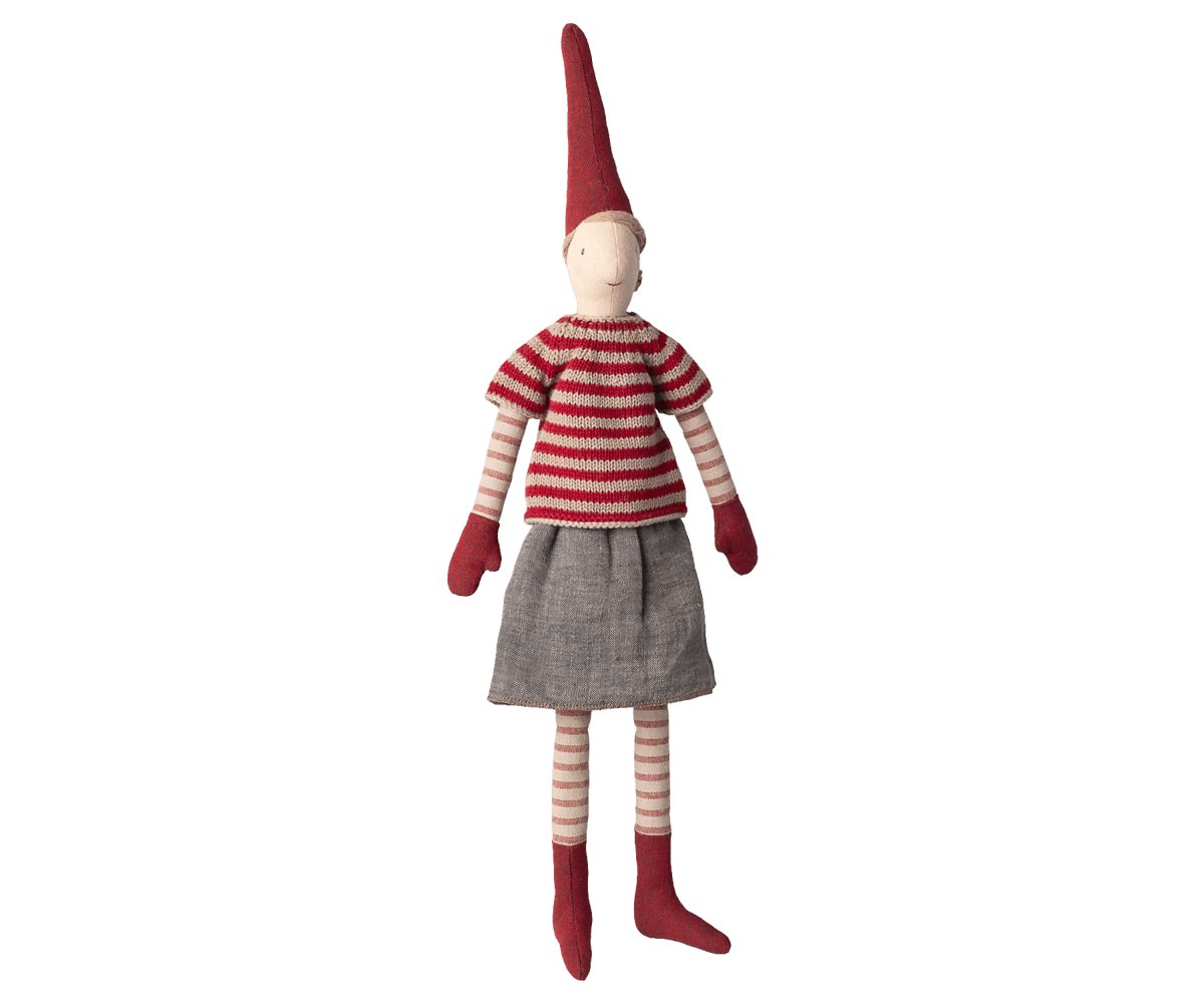 Sødeste nissepige fra Maileg med en flot rød stribet sweater og grå nederdel på.