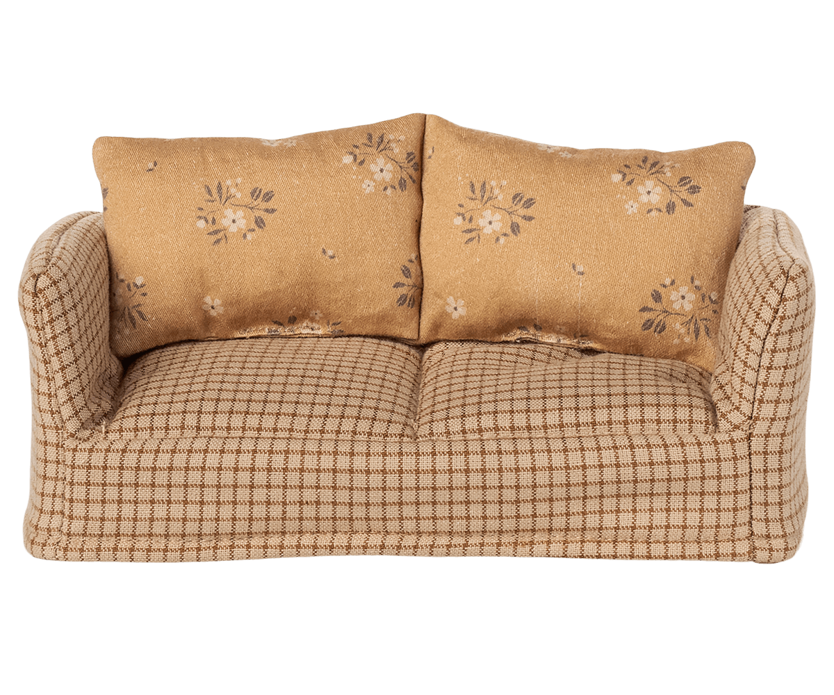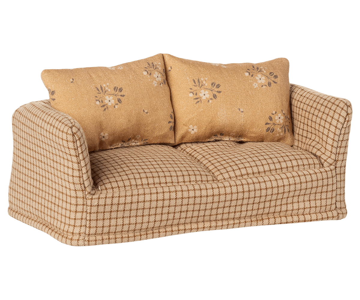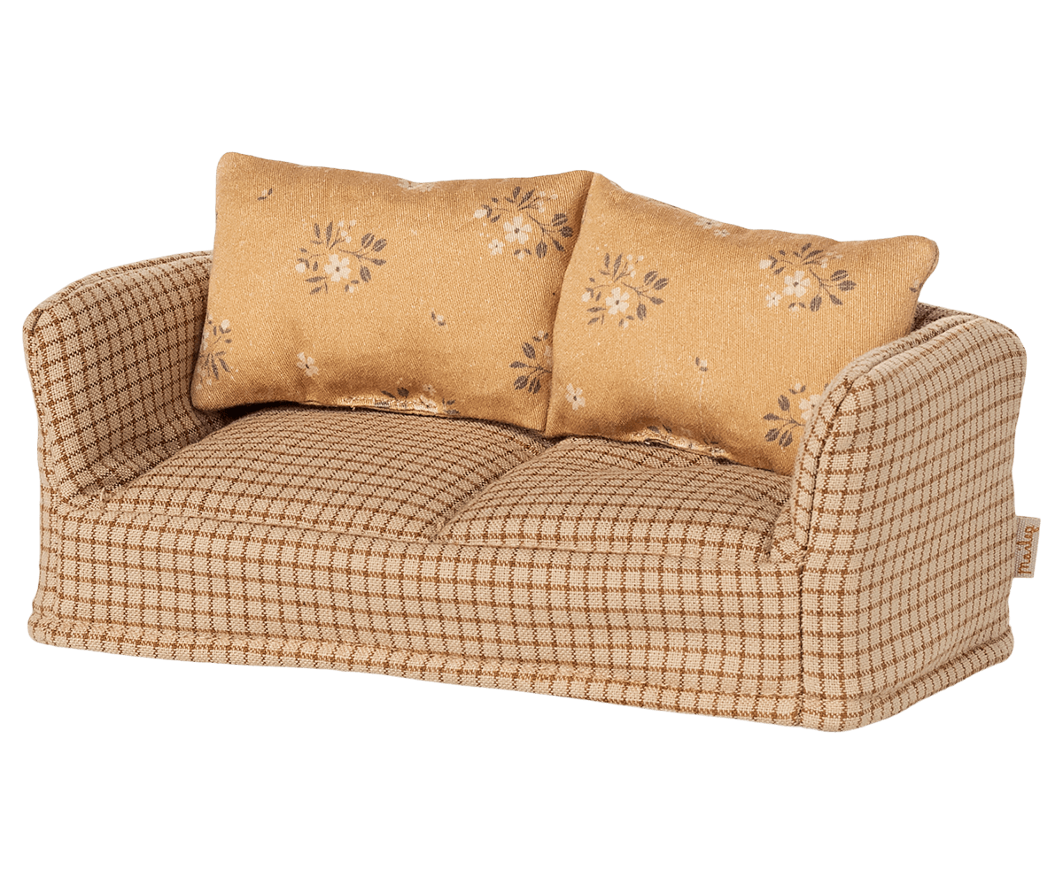 Gør musehjemmet ekstra hyggeligt med denne charmerende Maileg sofa i bløde, varme nuancer.