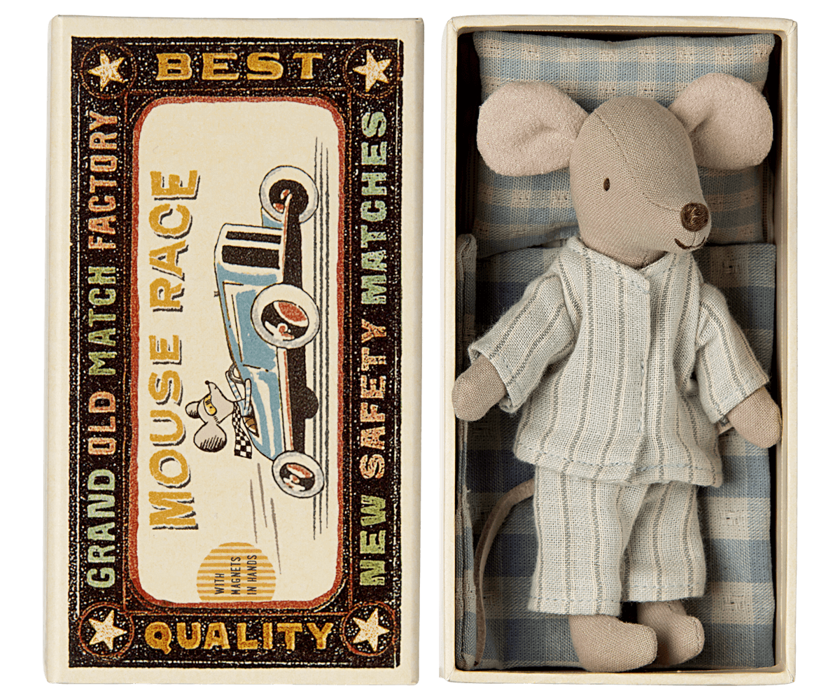 Maileg – Storebror mus i tændstikæske – Blå stribet nattøj