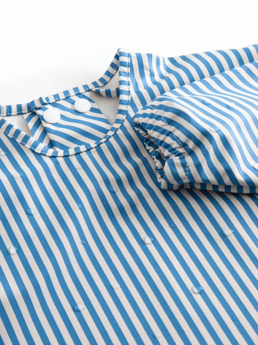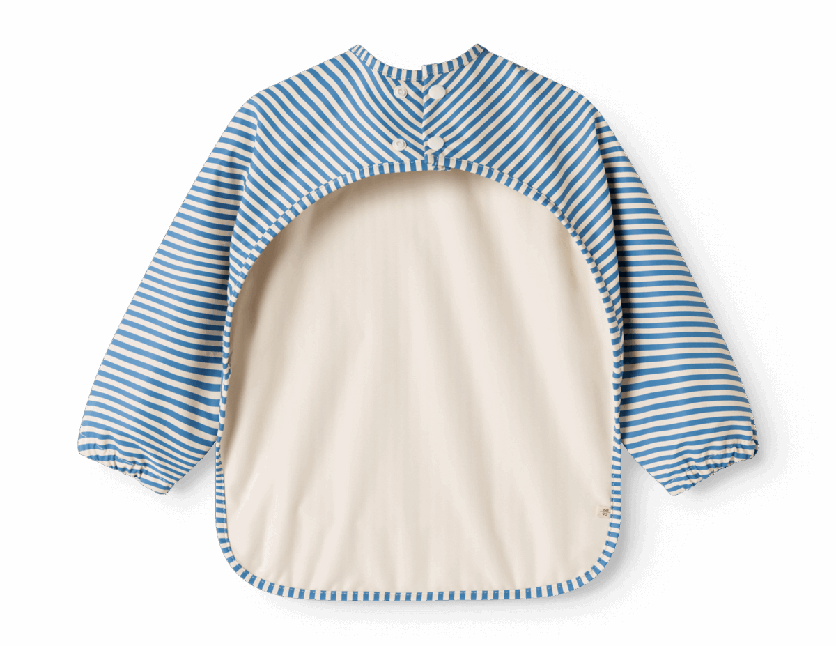 Praktisk forklæde fra Marmar Copenhagen med ærmer i en smart blå og hvid stribet model.