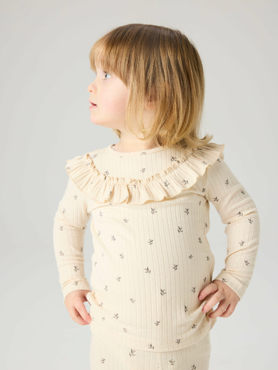 Det diskrete småblomstrede mønster på den lyse Buttercream farve skaber et blødt og elegant look, der passer perfekt til både hverdag og hyggelige anledninger.