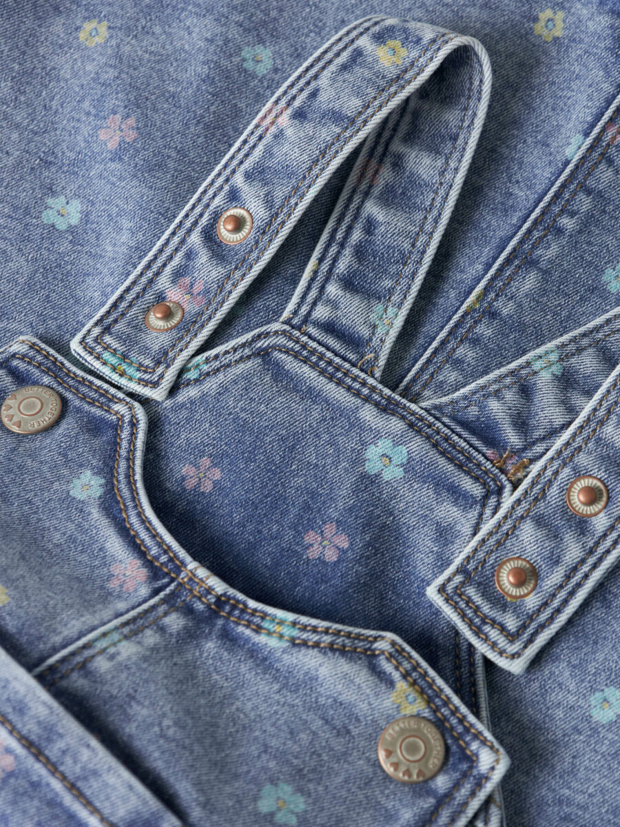 Den har et klassisk design med justerbare seler og et gennemgående blomster print, som giver et legende og moderne udtryk. Den slidstærke denimkvalitet gør den velegnet til både hverdag og leg.