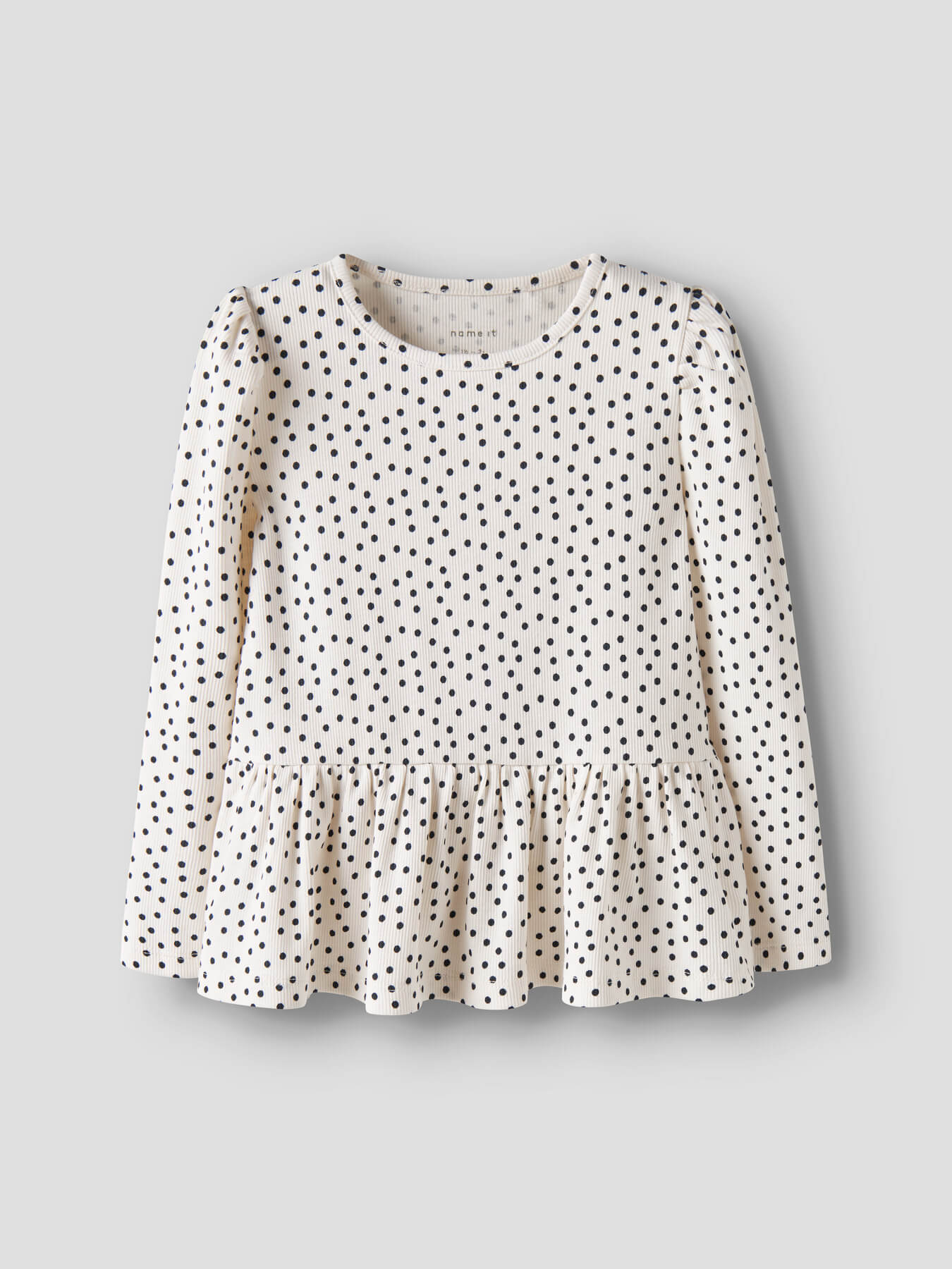 Super sød Tenna rib bluse fra Name It – en blød og komfortabel hverdagsbluse med fine prikker og peplumkant.