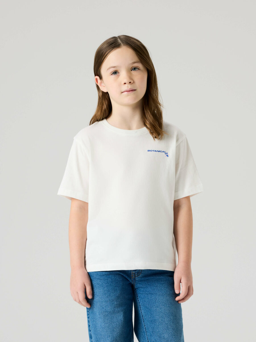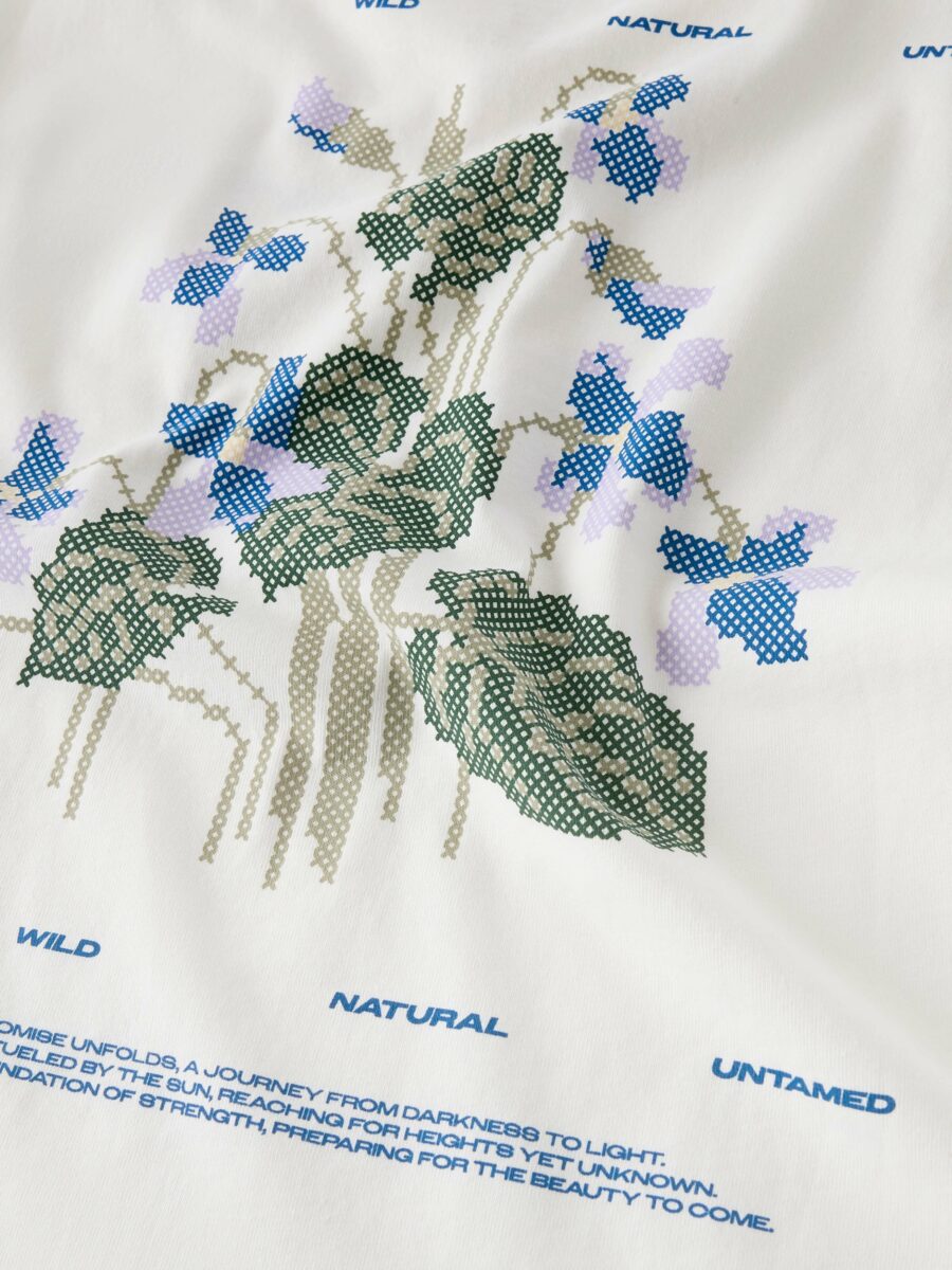 T-shirten har en klassisk pasform i den lyse farve Cloud Dancer og er pyntet med et smukt botanisk print på ryggen, som giver et cool og kreativt udtryk.