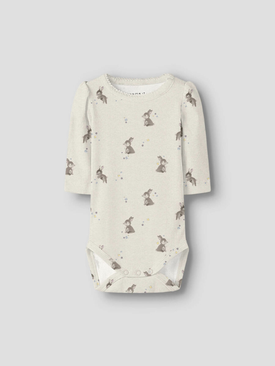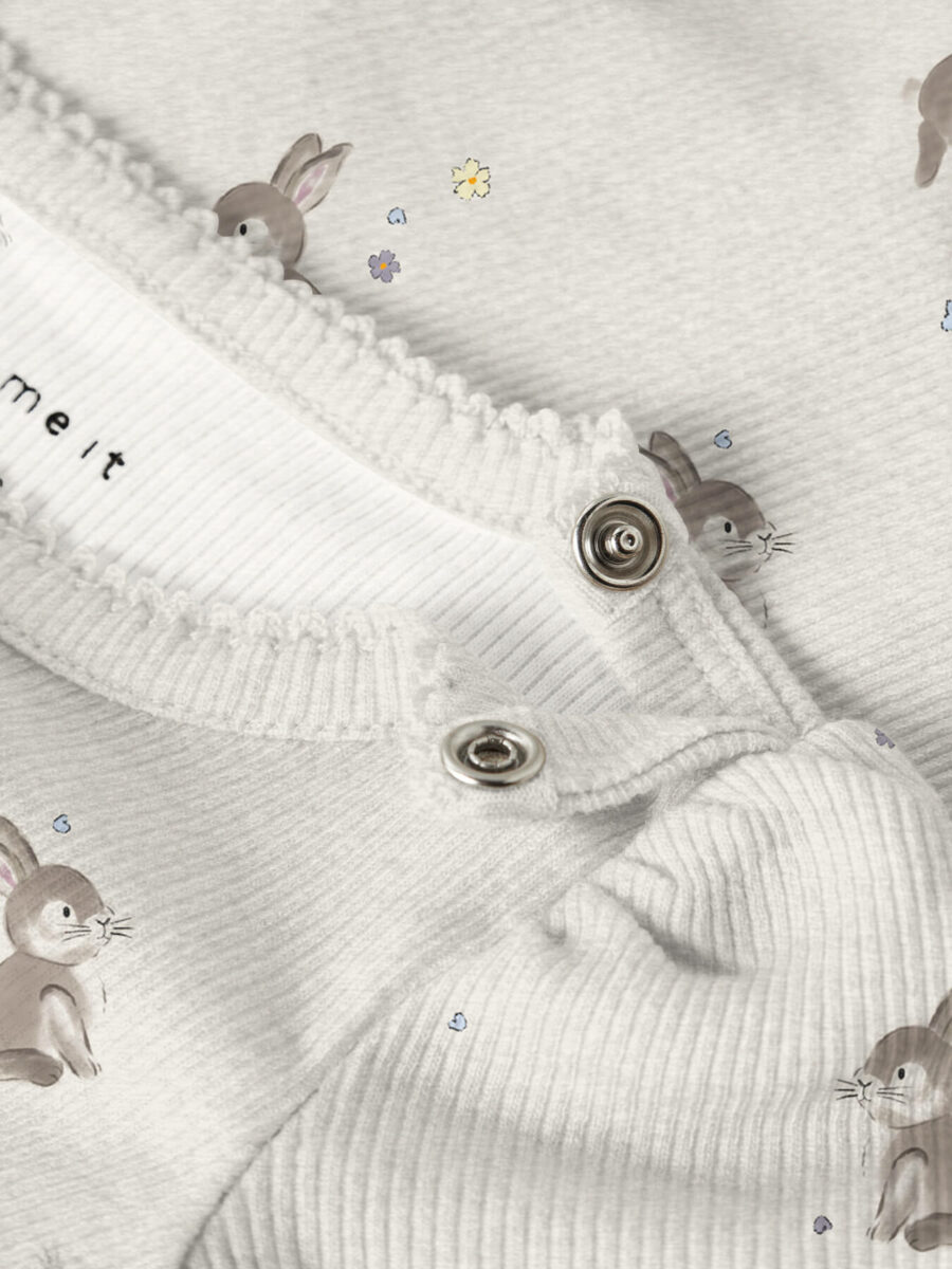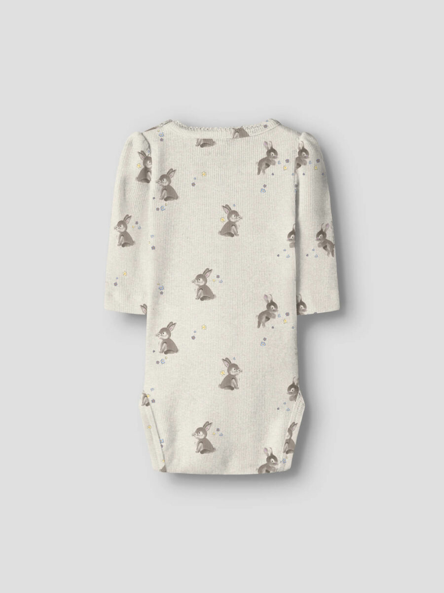 Dia bodyen er lavet med en lys baggrund og et sødt kanin print og lyse farver.