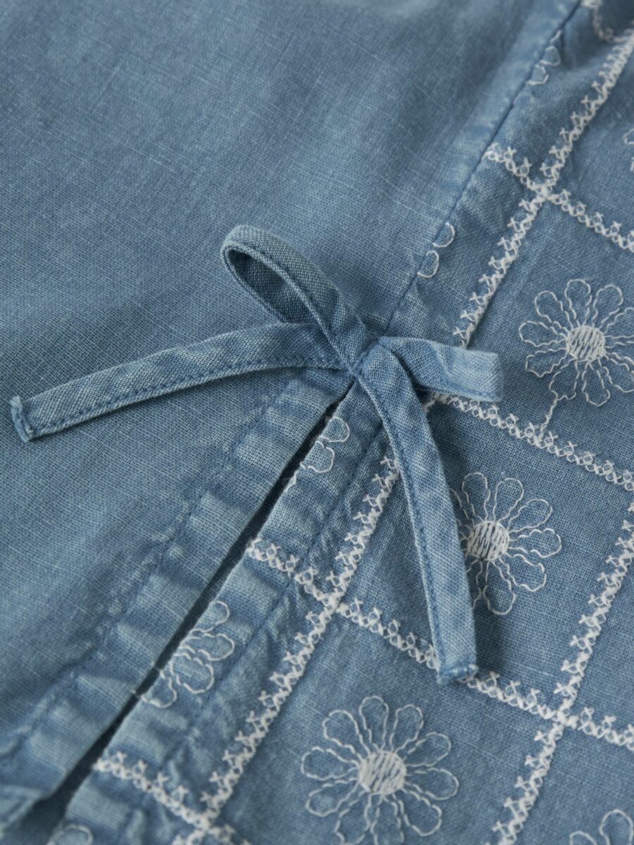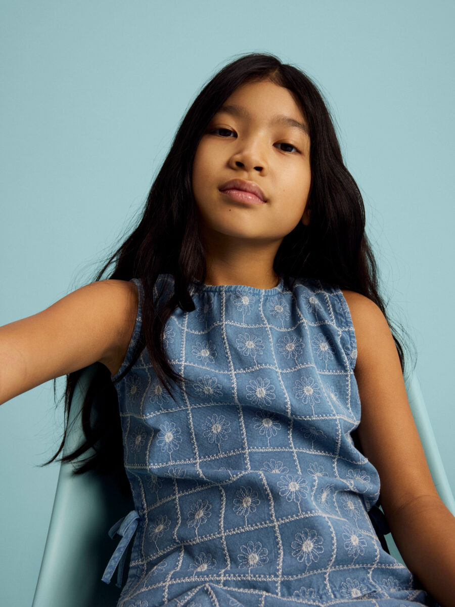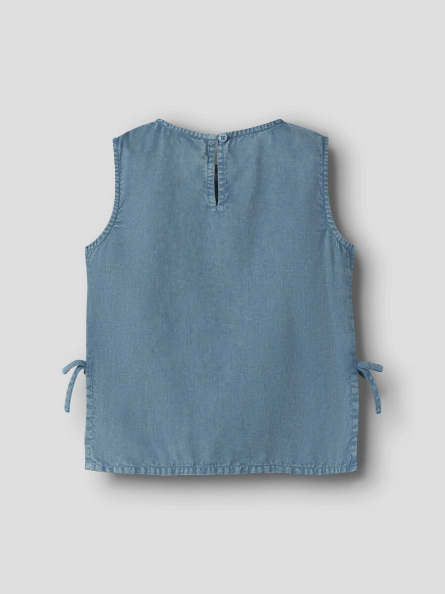 Sød og sommerlig top fra Name It i let chambray med fine broderede blomster.