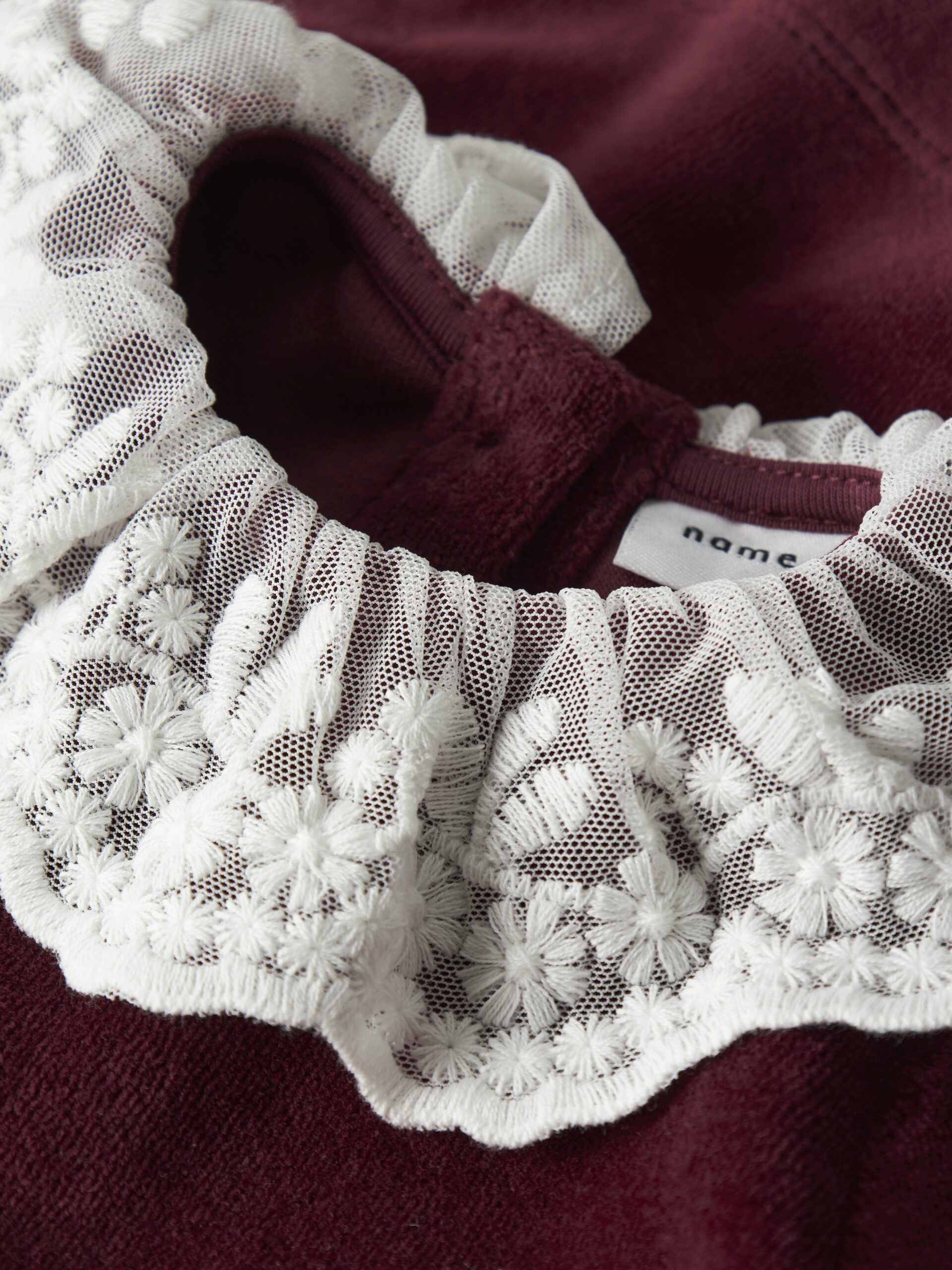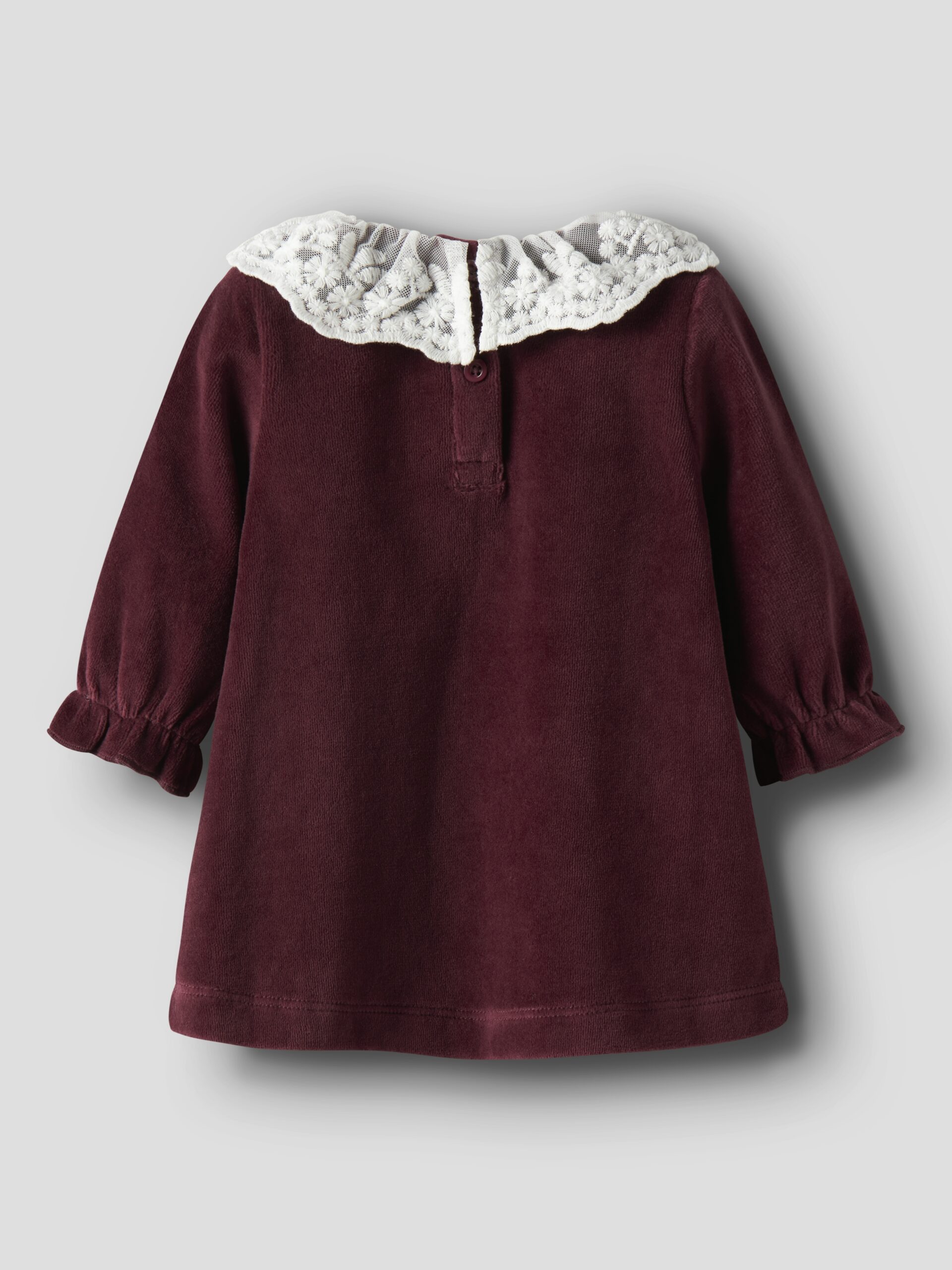 Smuk og blød rød velourkjole med en fin blonde krave.