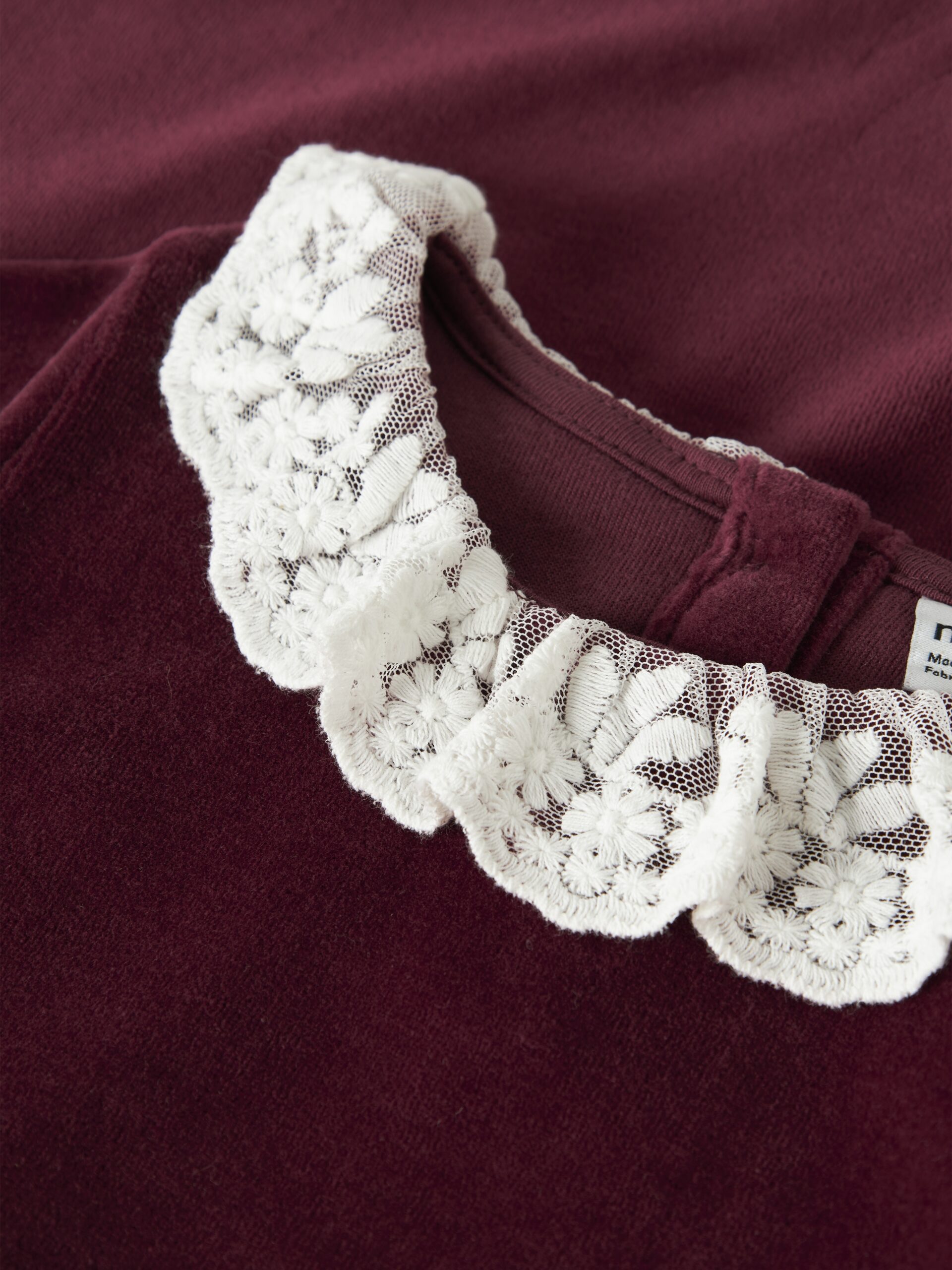 Smuk og blød rød velourkjole med en fin blonde krave.