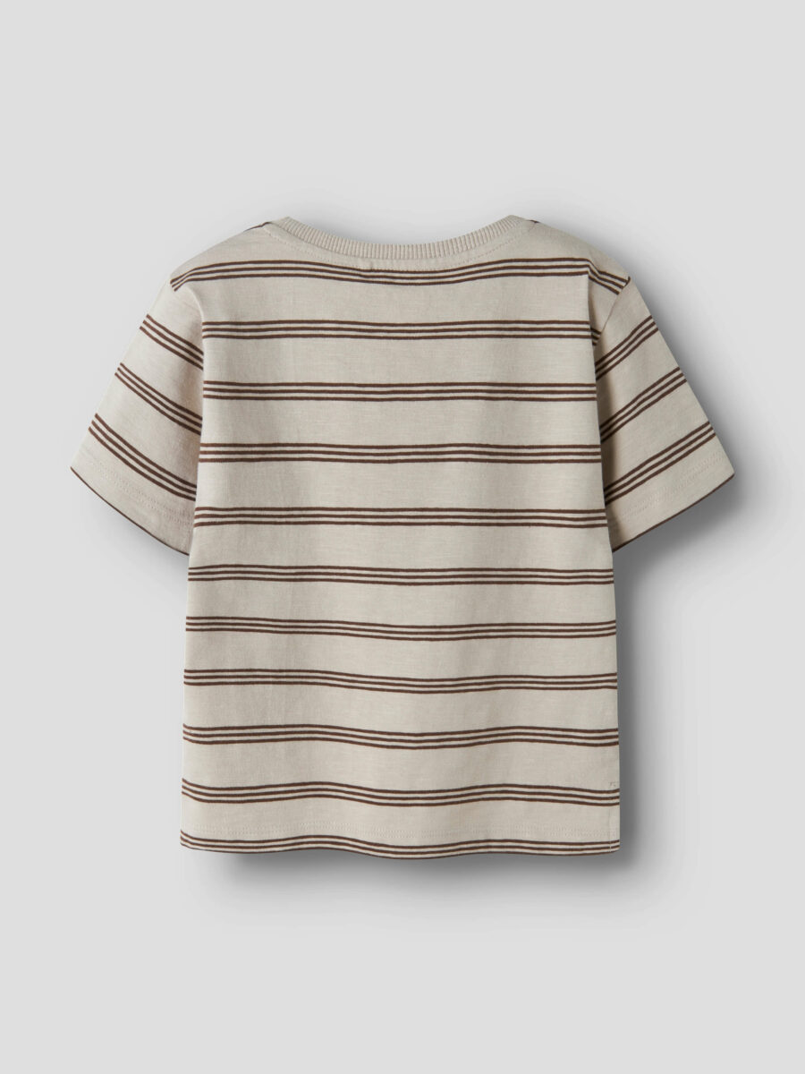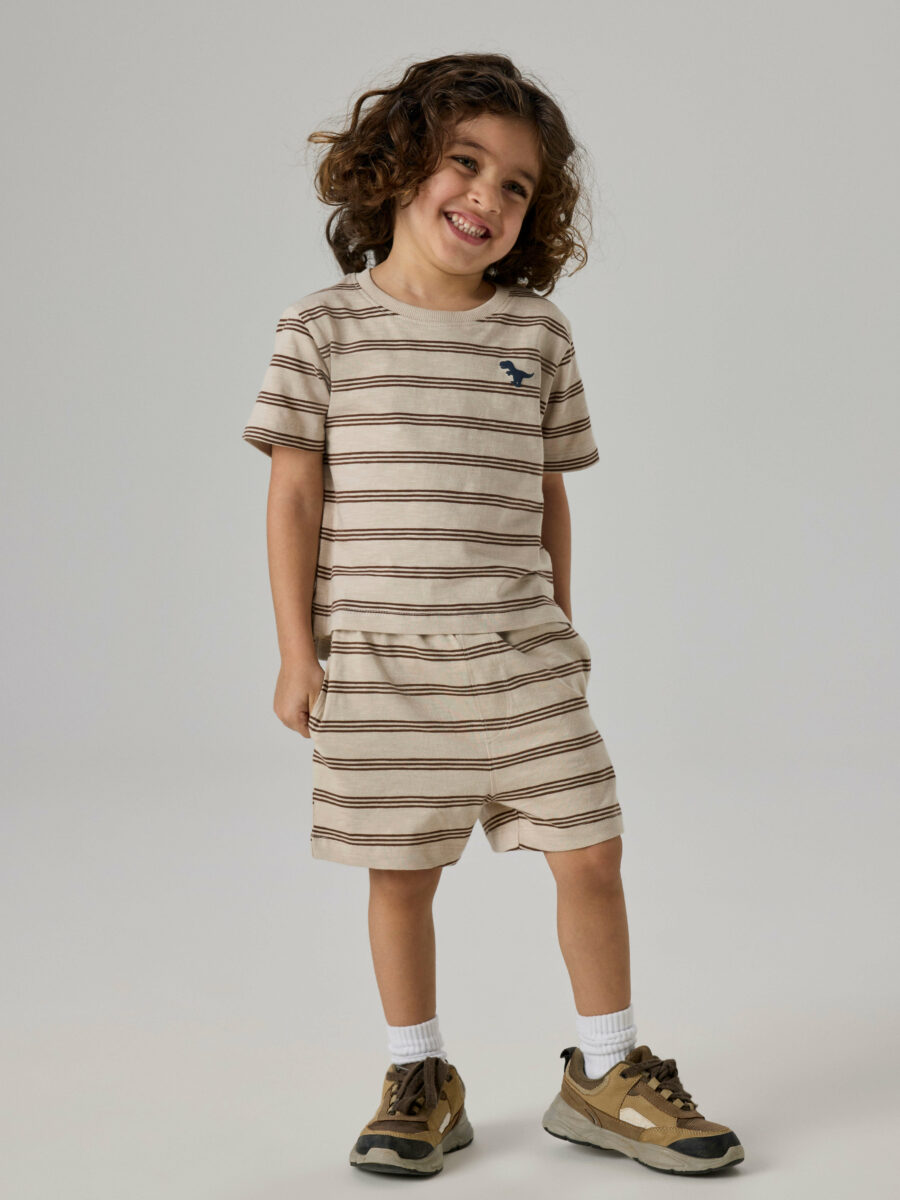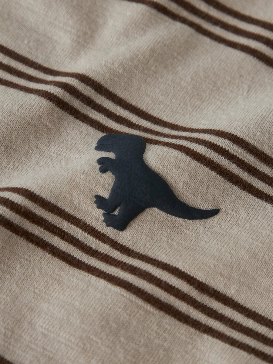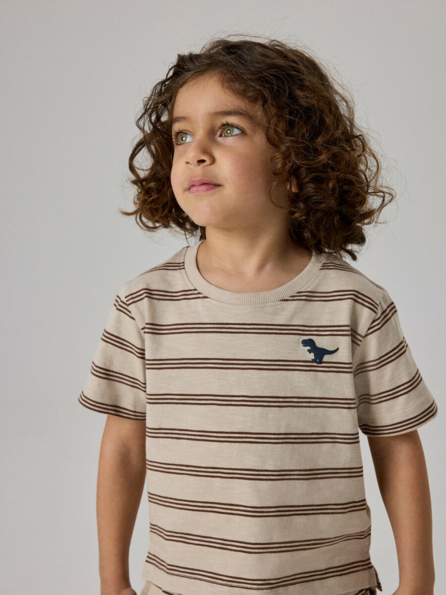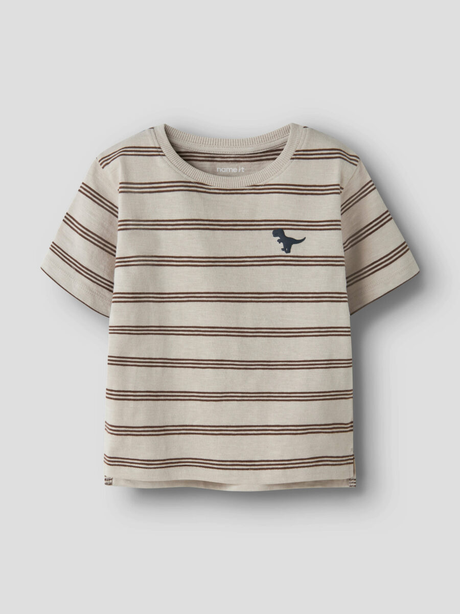 Sød og afslappet T-shirt med striber og dinosaur detalje fra Name It. Den lette og bløde kvalitet gør den behagelig at have på, mens de rolige farver giver et stilrent og tidløst look. Det lille dinosaurprint på brystet tilføjer et sjovt og charmerende twist.