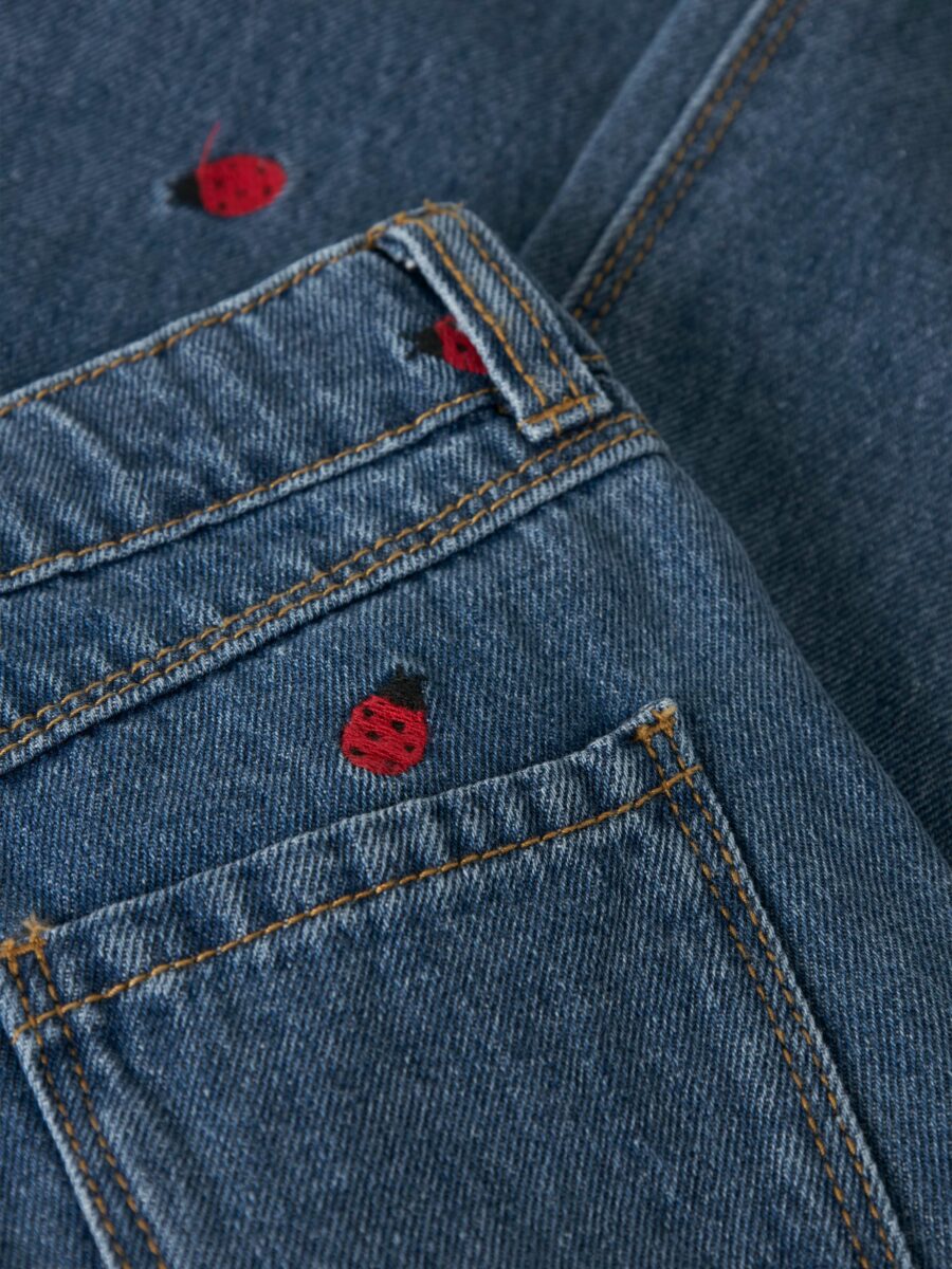 Seje og komfortable mom fit jeans fra Name It med fine broderede mariehøns. Jeansene har en trendy mom fit pasform med lidt løsere hofte og ben, samt justerbar talje for optimal komfort. De små broderede detaljer giver et legende og unikt udtryk. Den bløde denimkvalitet giver et cool look samtidig med, at den er behagelig at have på.