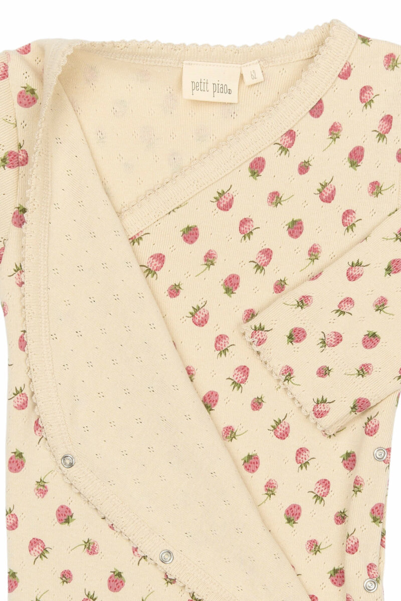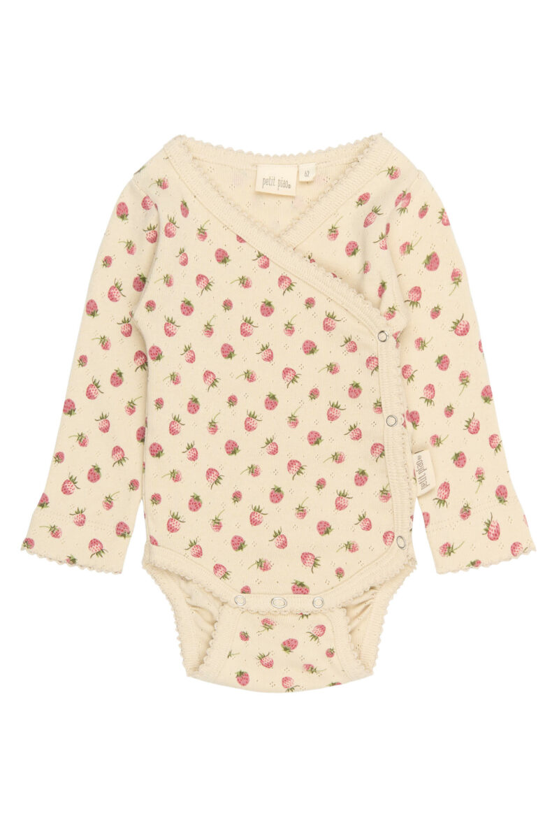 Sødeste slå-om-body fra Petit Piao med fint hulmønster, feminine detaljer og jordbærprint.