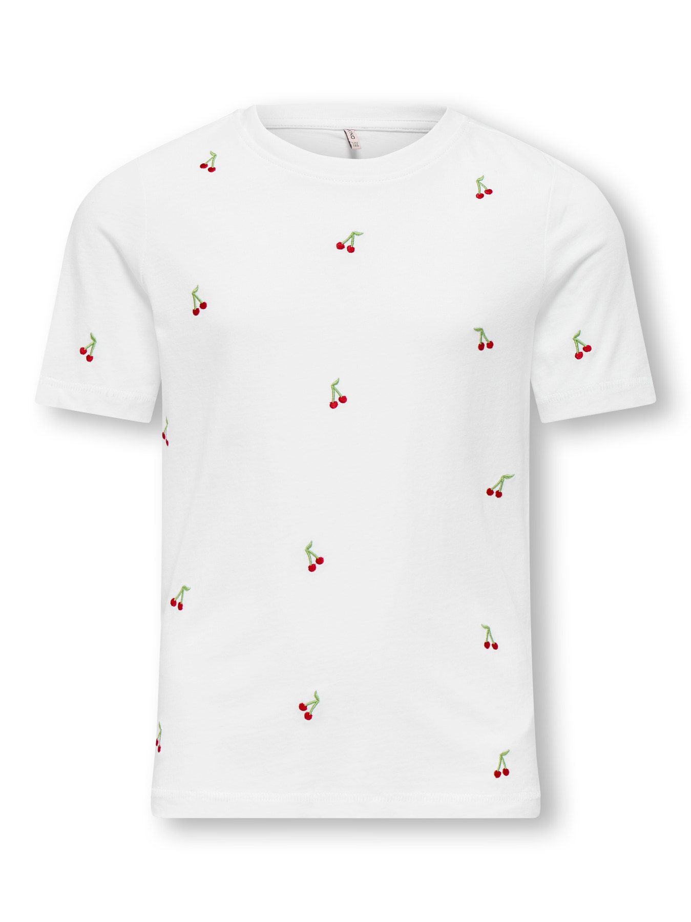 Enkel og fin t-shirt med kirsebær på fronten fra Kids Only. T-shirten er lavet i 100% økologisk bomuld og har fint broderi på fronten. Passer helt perfekt ind i basis garderoben.
