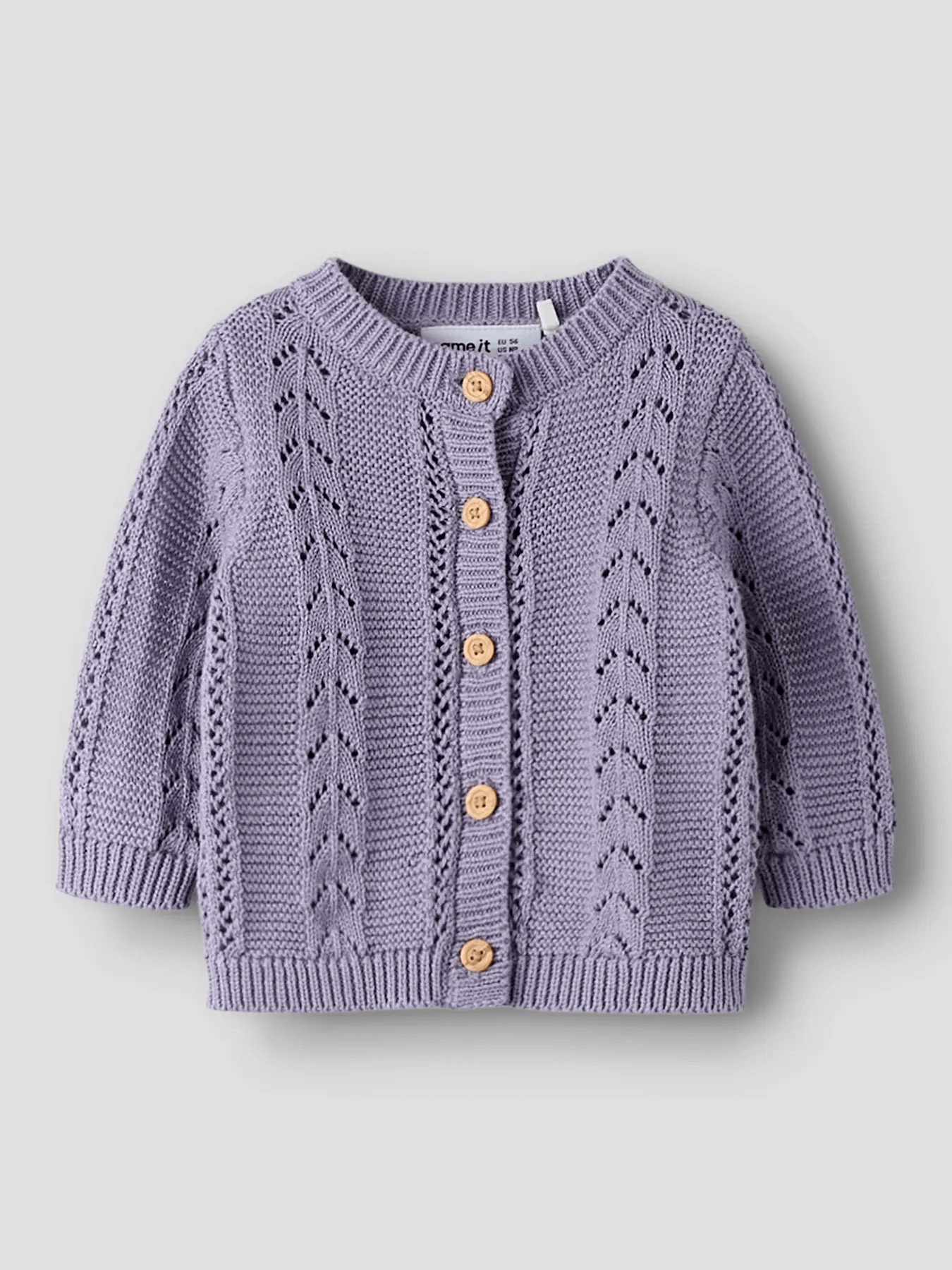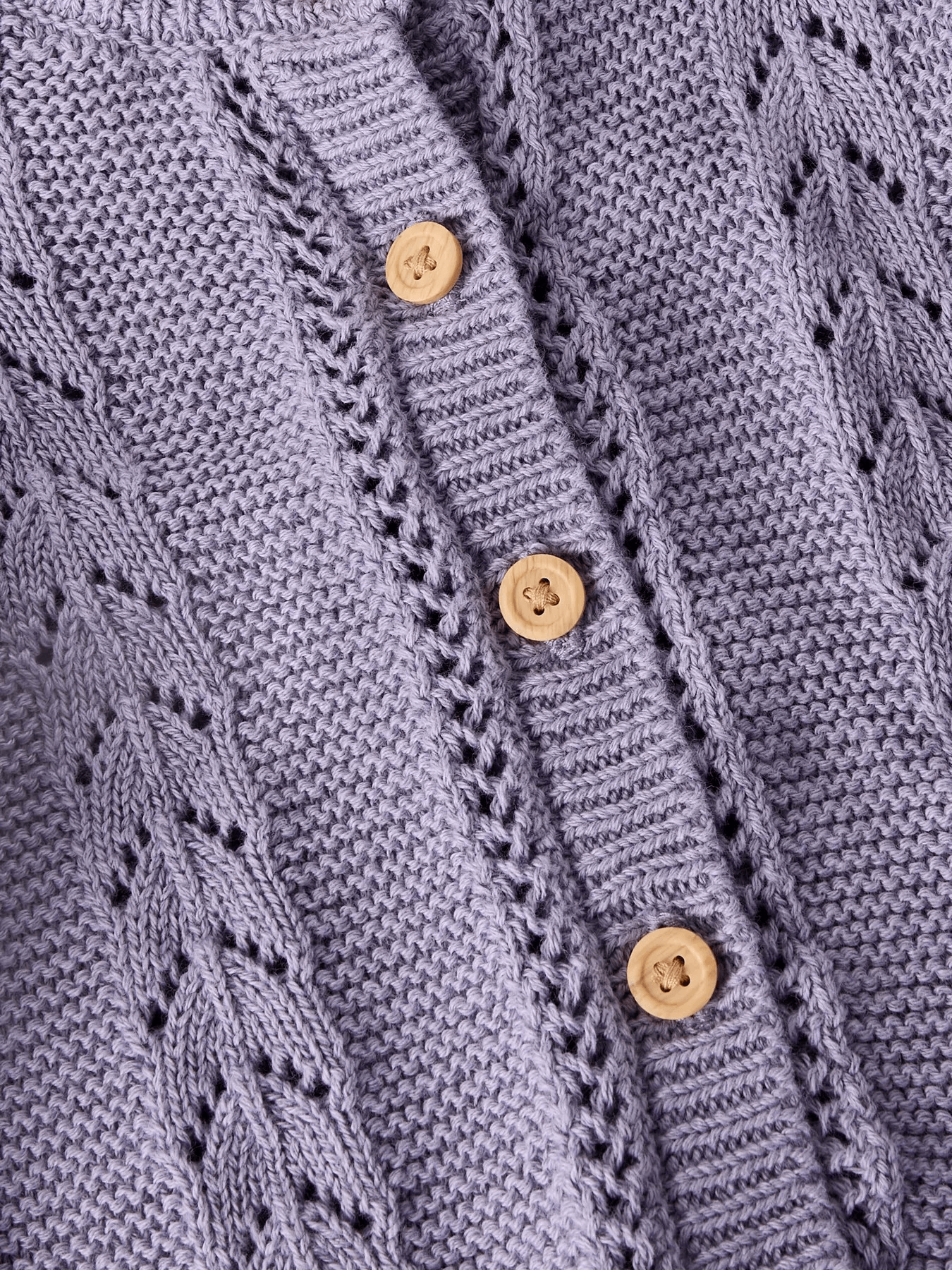 Her i en smuk lilla farve med fint hulmønster og små træfarvede knapper.