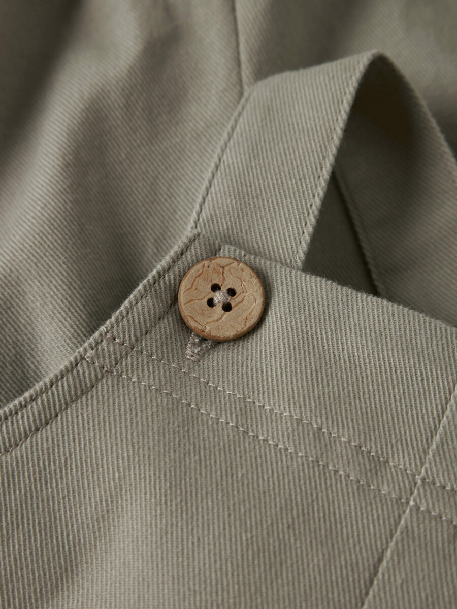 Den vævede twillkvalitet med det klassiske diagonale mønster giver et enkelt og roligt udtryk, og den løse pasform sikrer god bevægelsesfrihed. Modellen er designet med små frontlommer og fine træknapper i lukningen.